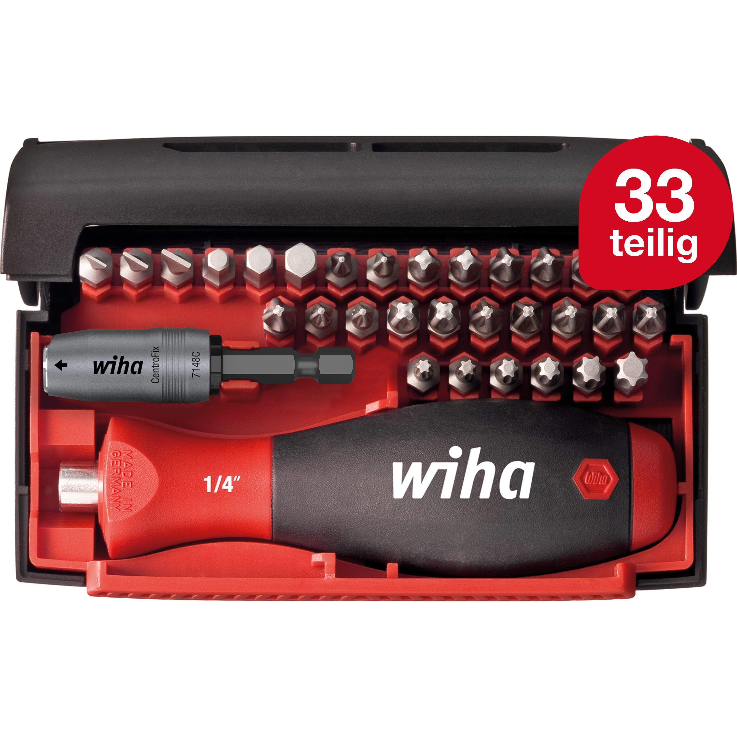 Gehäuse: Robuste Box aus hochfestem Kunststoff. Anwendung: Durch Handgriff und Bithalter sofort sowohl für Maschinen- als auch für Handbetrieb einsetzbar. Bithalter: CentroFix Force Schnellwechselhalter, magnetisch. Bits: 25 mm Standard-Bits. Gehäuse: Auf Knopfdruck öffnet sich die Box automatisch. Griff: Wiha SoftFinish® Mehrkomponenten-Griff, magnetisch, mit Bitaufnahme 1/4". DIN 3126, ISO 1173, Form Inhalt: 1x Bit Standard 25 mm Schlitz 1/4" 4,5 mm (01623) 1x Bit Standard 25 mm Schlitz 1/4" 5,5 mm (01624) 1x Bit Standard 25 mm Schlitz 1/4" 6,5 mm (01626) 2x Bit Standard 25 mm Phillips 1/4" PH1 (01657) 5x Bit Standard 25 mm Phillips 1/4" PH2 (01658) 2x Bit Standard 25 mm Phillips 1/4" PH3 (01659) 2x Bit Standard 25 mm Pozidriv 1/4" PZ1 (01688) 5x Bit Standard 25 mm Pozidriv 1/4" PZ2 (01689) 2x Bit Standard 25 mm Pozidriv 1/4" PZ3 (01690) 1x Bit Standard 25 mm TORX® 1/4" T10 (01716) 1x Bit Standard 25 mm TORX® 1/4" T15 (01717) 1x Bit Standard 25 mm TORX® 1/4" T20 (01718) 1x Bit Standard 25 mm TORX® 1/4" T25 (01719) 1x Bit Standard 25 mm TORX® 1/4" T30 (01721) 1x Bit Standard 25 mm TORX® 1/4" T40 (01722) 1x Bit Standard 25 mm Sechskant 1/4" 4,0 mm (01706) 1x Bit Standard 25 mm Sechskant 1/4" 5,0 mm (01707) 1x Bit Standard 25 mm Sechskant 1/4" 6,0 mm (01708) 1x Bithalter CentroFix Force mechanisch verriegelbar 1/4", magnetisch in Box 60 mm (39133) 1x Schraubendreher mit Bithalter SoftFinish® magnetisch 1/4" 112 mm (32160) 1x Collector Box