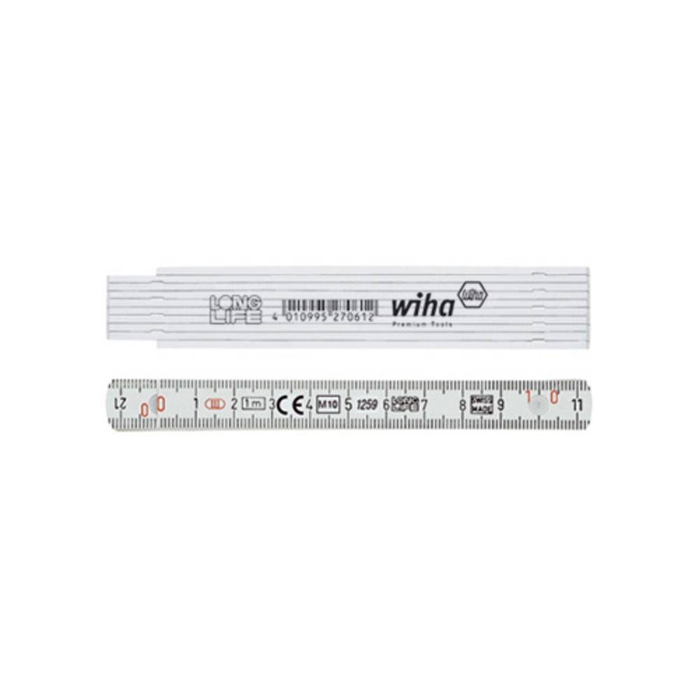 With metal ends. Material: Composite design: two top layers made of longitudinal glass fibres absorb bending forces and ensure more rigidity than wooden rules. No swelling with water contact, resistant to chemicals. Joints: Play-free, wear-free and dirt-resistant joint with spring pin for constant tension. Tight 90° and 180° latching of all joints. Scale: Grey/white version: Deep-embossed black scale in 1 mm increments, red embossed tens scale. Red/black version: Deep-embossed white scale in 1 mm increments, white embossed tens scale. Accuracy: CE conformity, EU standard accuracy class II. Extra: Metal ends which cannot be lost on the first and last blade. Readable from both sides through a second, backwards running scale (Recto Verso)..