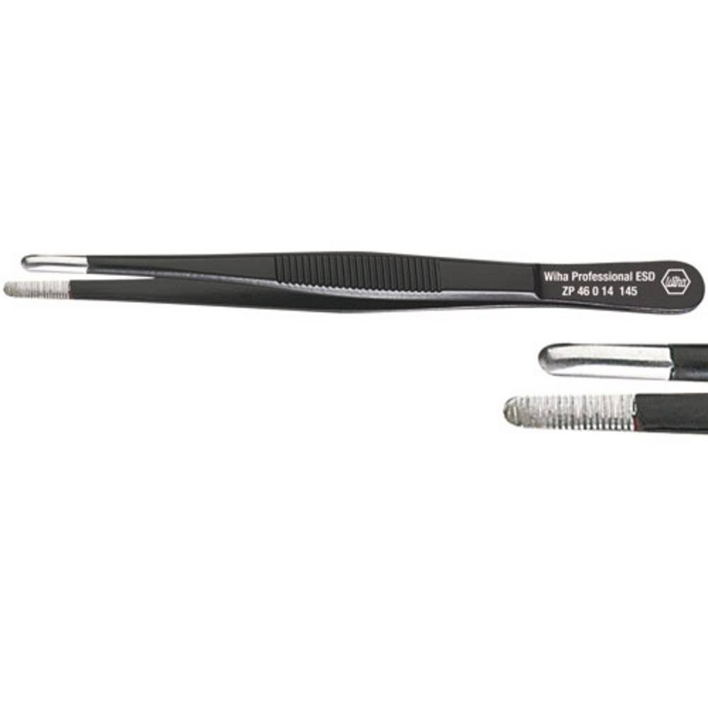 Standards: IEC 61340-5-1. Tip form: Straight with approx. 4 mm wide, round tip. Design: Fine-tooth gripping surface, grooved gripping surface. Non-glare black coated, anti-static. Anti-magnetic and acid-resistant. Surface resistance 10^6 - 10^9 ohms. Material: Special alloyed, non-rusting, chromium-nickel stainless steel. Application: Universal tweezers for all current electronics applications..