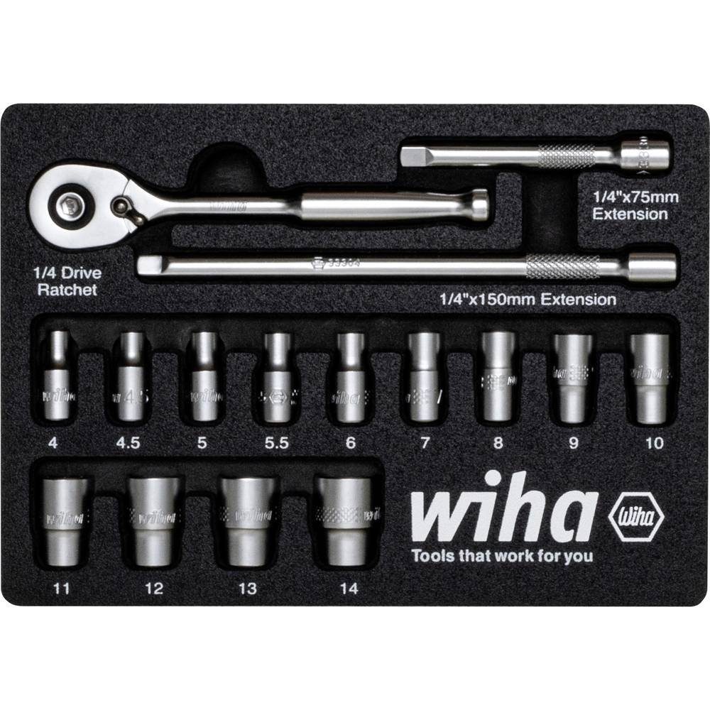 Stark festgezogene Schrauben zu öffnen erfordert einen enormen Kraftaufwand. Mit den Steckschlüsseleinsätzen von Wiha bekommt der Anwender jede Verschraubung einfach geöffnet. Mit dem Set aus den 13 gängigsten 1/4 Steckschlüsseleinsätzen in den Größen von 4 - 14 mm, einem Ratschenschlüssel und zwei Verlängerungen ist der Anwender bestens ausgestattet. Der beiliegende Ratschenschlüssel verleiht dem Anwender in Kombination mit der Auswahl an Steckschlüsseln die notwendige Flexibilität im Arbeitseinsatz. Bei Arbeiten mit dem Ratschenschlüssel hat der Anwender dank der Feinverzahnung mit 72 Zähnen einen kurzen Rückholwinkel. Dabei kann der Rechts-/ Linkslauf durch den integrierten Umschalthebel variabel eingestellt werden. In Kombination mit den beiliegenden Verlängerungen können tiefliegende Muttern und Schrauben problemlos erreicht werden. Die Steckschlüssel und Verlängerungen werden mechanisch verriegelt. Der Wechsel erfolgt durch Drücken des Auslöseknopfs. Hergestellt aus hochwertigem Chrom-Vanadium-Stahl stehen die Steckschlüsseleinsätze für Langlebigkeit und Robustheit, nicht zuletzt dank ihrer korrosionsbeständigen und leicht zu reinigenden Oberfläche. Der gesamte Set Inhalt ist geordnet und übersichtlich in einer Schaumstoffeinlage aufbewahrt, in welcher das schnelle Finden des passenden Steckschlüssels durch Kennzeichnungen unterstützt wird.Dabei verhilft die griffige Oberfläche, zu starkem Halt selbst in öligen oder nassen Arbeitssituationen..