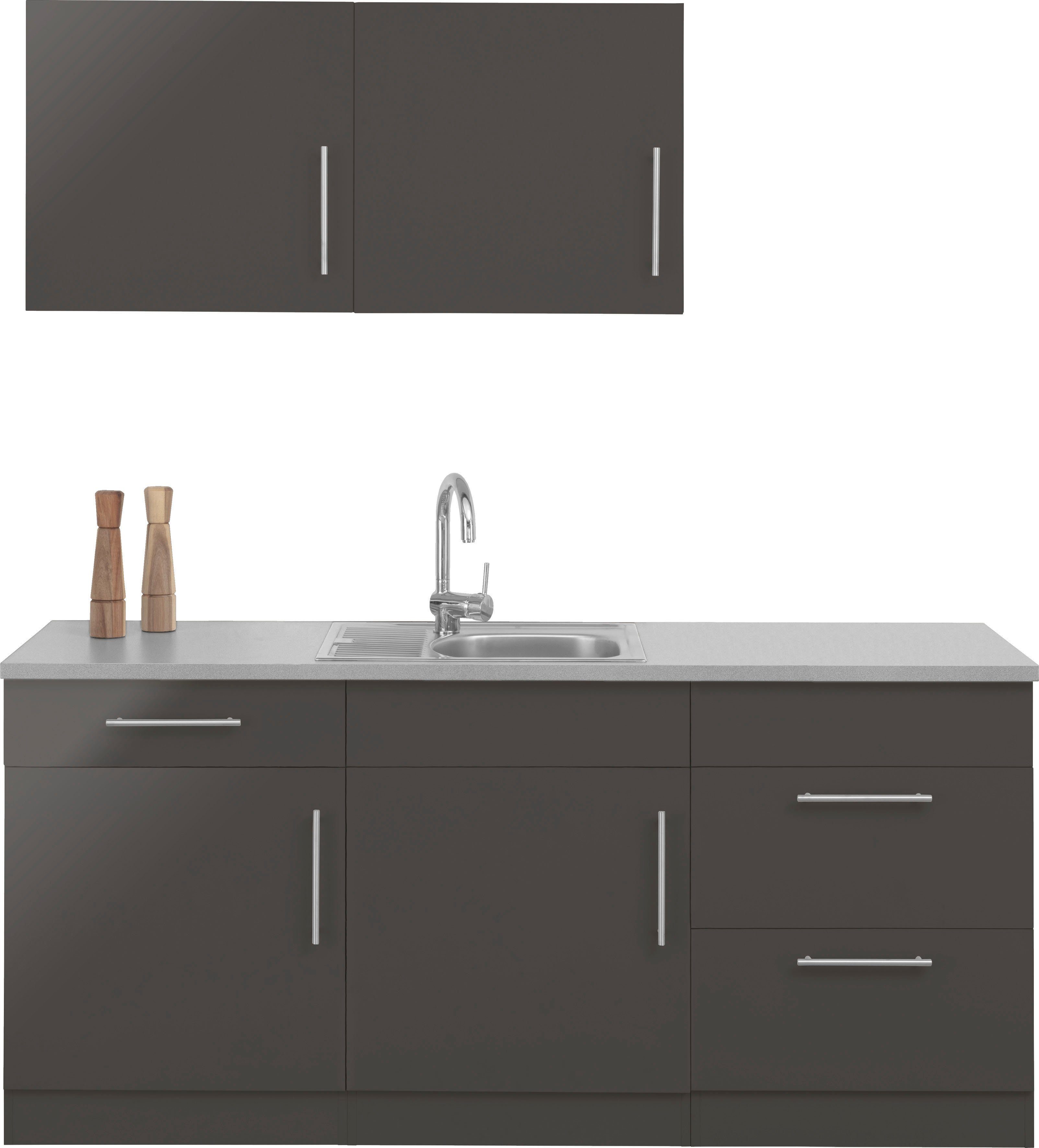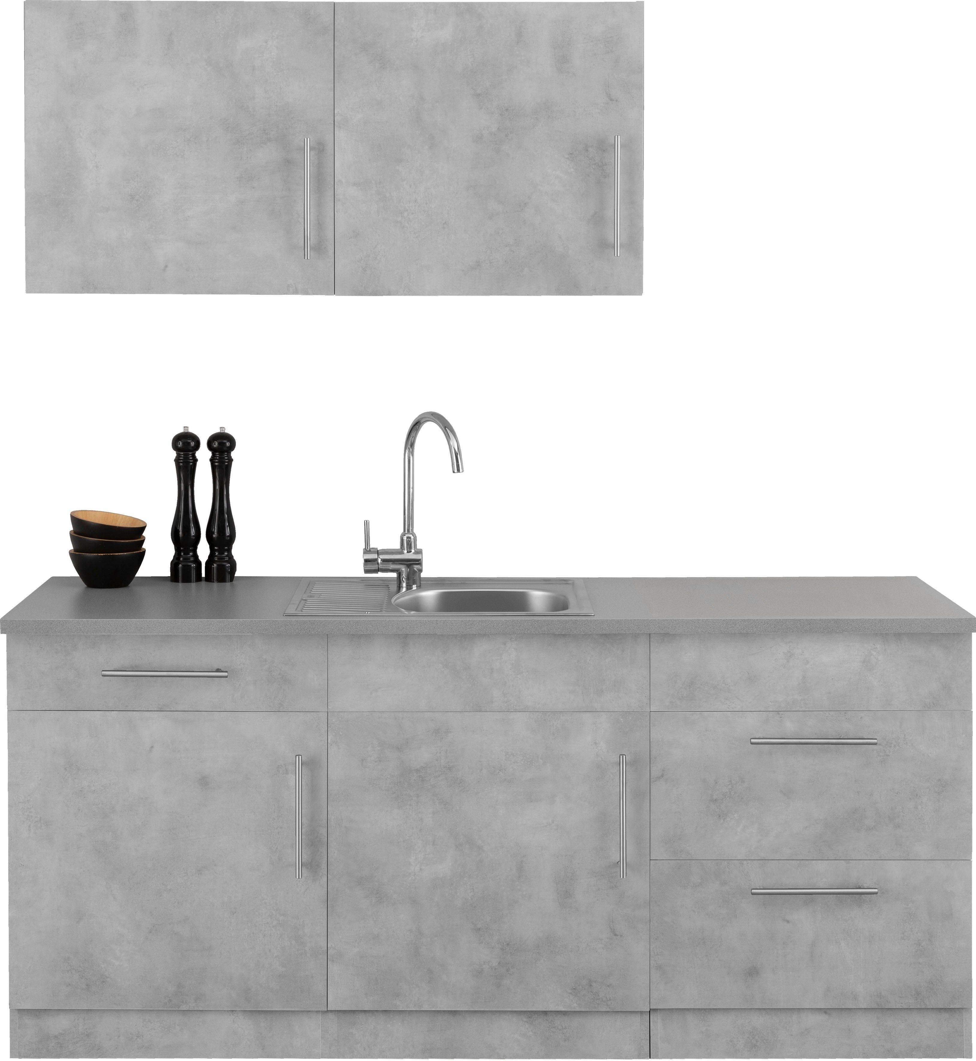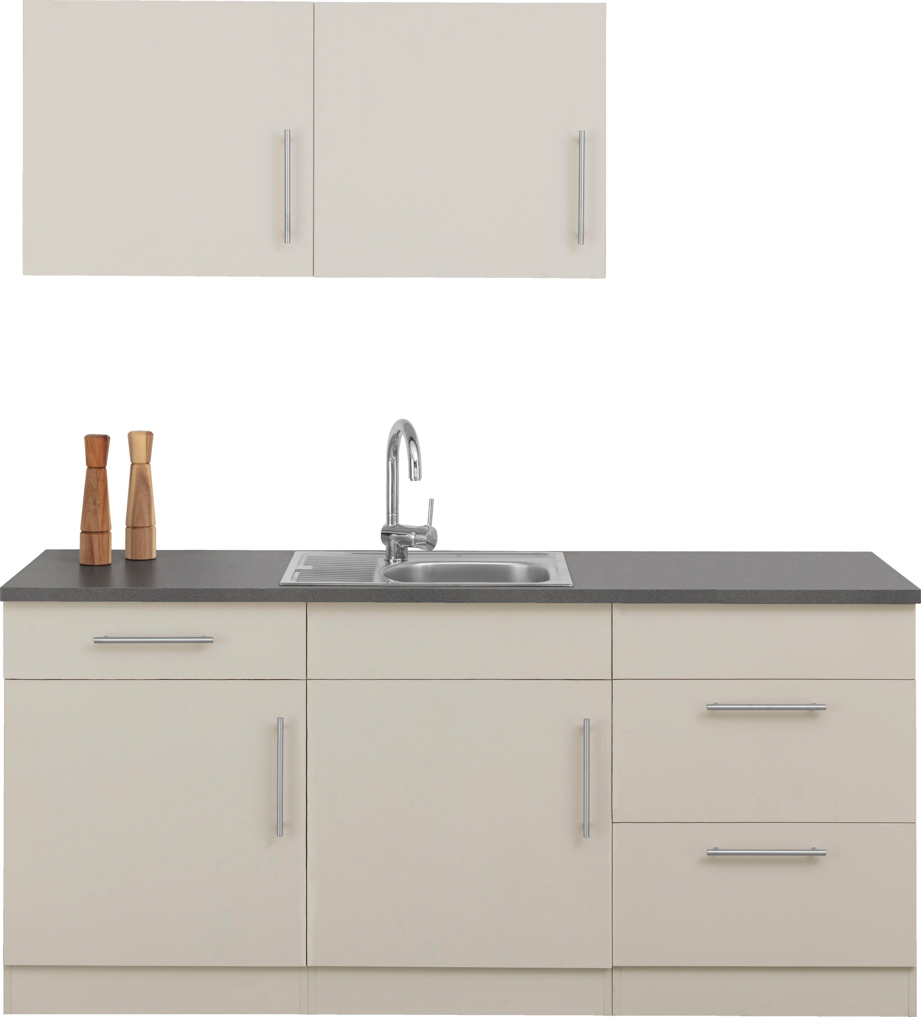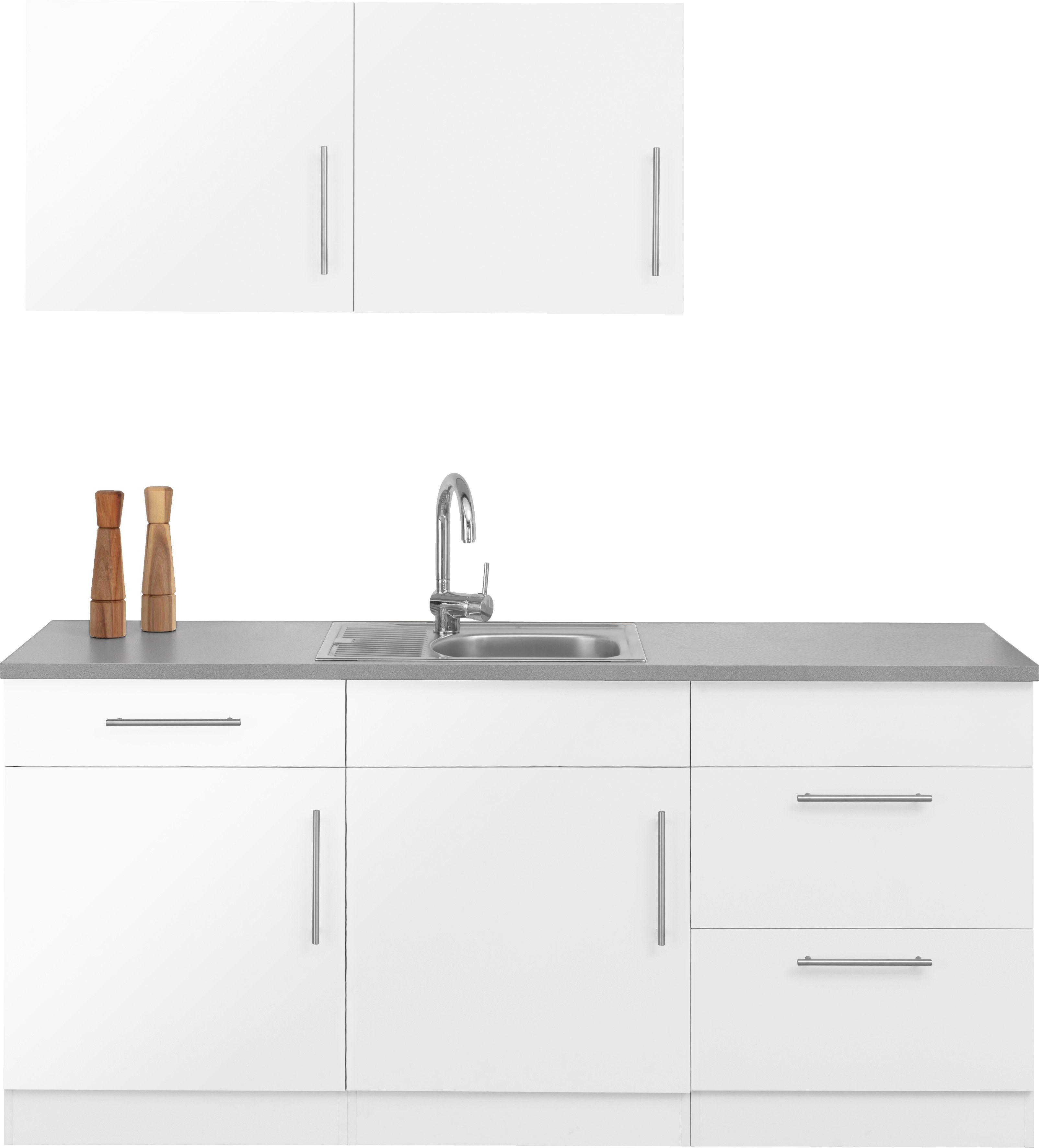 Ausstattung | Durchgehende Arbeitsplatte Einlegeböden höhenverstellbar Laufleisten der Schubkästen aus Metall Metallgriffe Sockelhöhe nicht verstellbar Türen wahlweise rechts/links montierbar inkl. Edelstahl-Einbauspüle, mit Abtropffläche ohne E-Geräte |