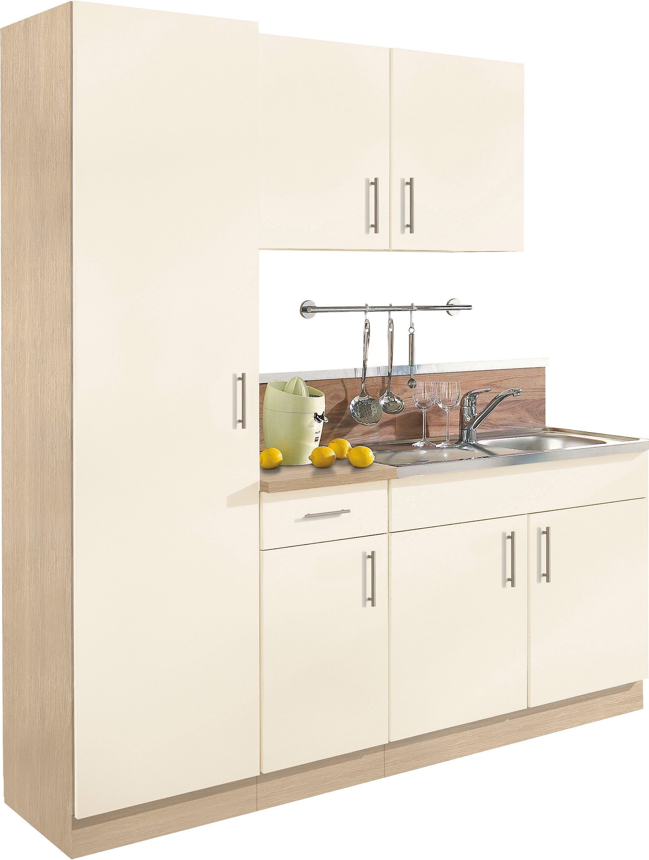 Ausstattung | Einlegeböden höhenverstellbar Sockelhöhe nicht verstellbar Türen wahlweise rechts/links montierbar inkl. Edelstahl-Auflagespüle, mit Abtropffläche ohne E-Geräte |