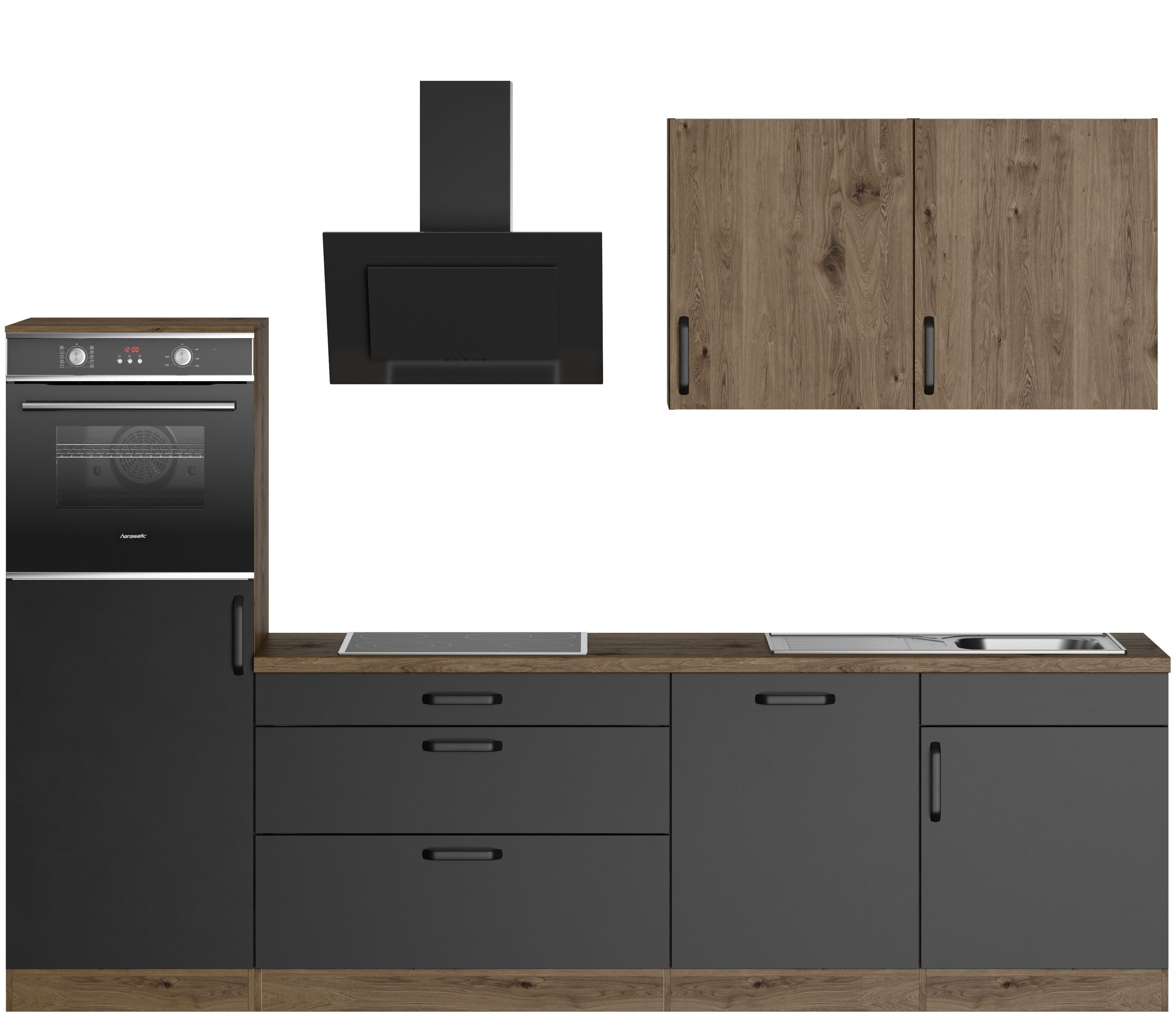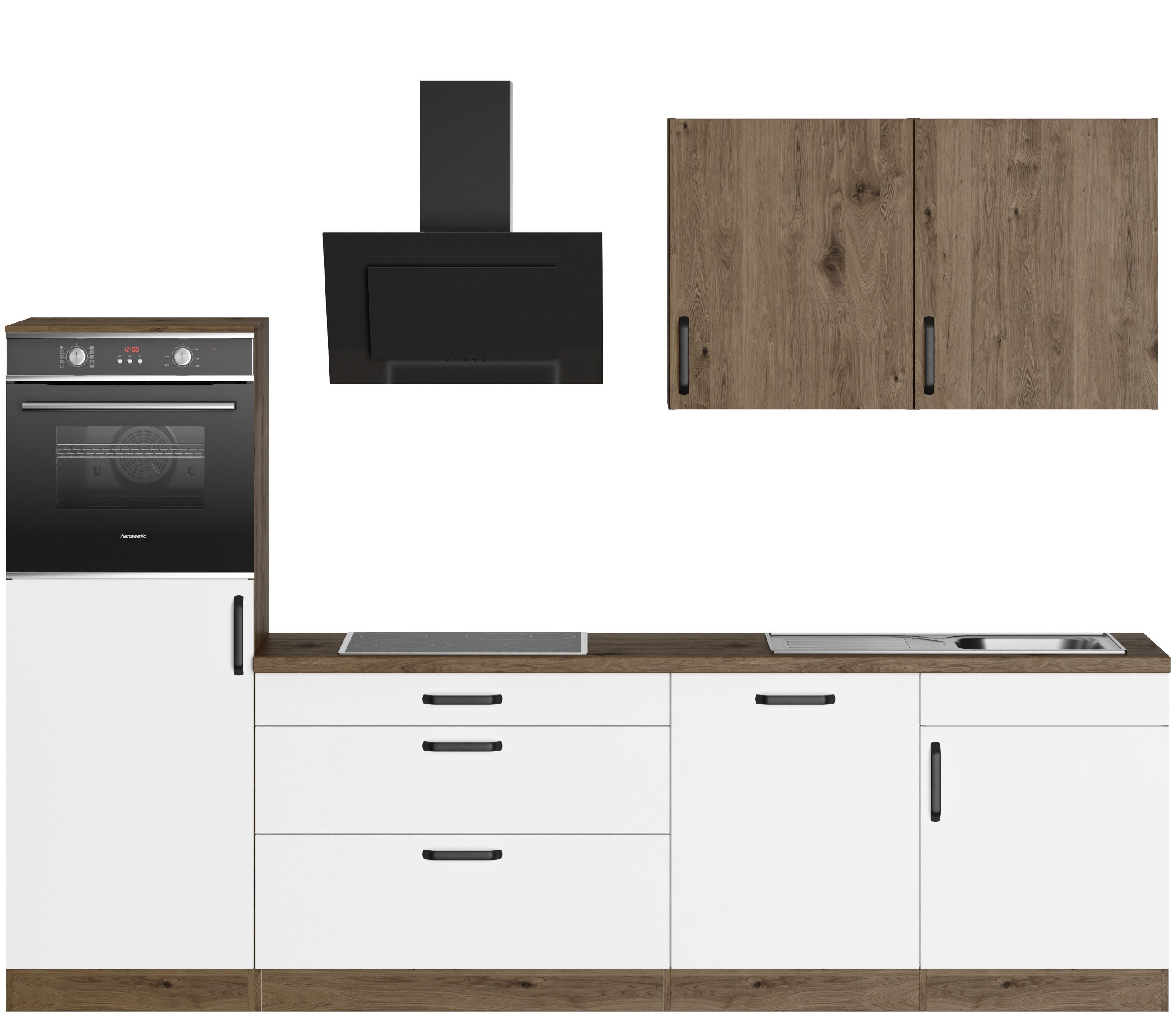 Ausstattung | Durchgehende Arbeitsplatte Einlegeböden höhenverstellbar Laufleisten der Schubkästen aus Metall Metallgriffe Sockelhöhe nicht verstellbar Türen wahlweise rechts/links montierbar inkl. Edelstahl-Einbauspüle, mit Abtropffläche ohne E-Geräte |