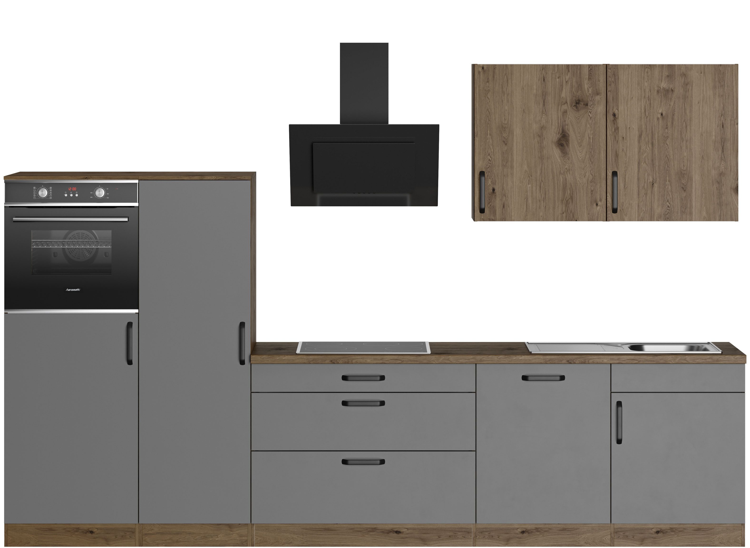 Ausstattung | Durchgehende Arbeitsplatte Einlegeböden höhenverstellbar Laufleisten der Schubkästen aus Metall Metallgriffe Sockelhöhe nicht verstellbar Türen wahlweise rechts/links montierbar inkl. Edelstahl-Einbauspüle, mit Abtropffläche ohne E-Geräte |