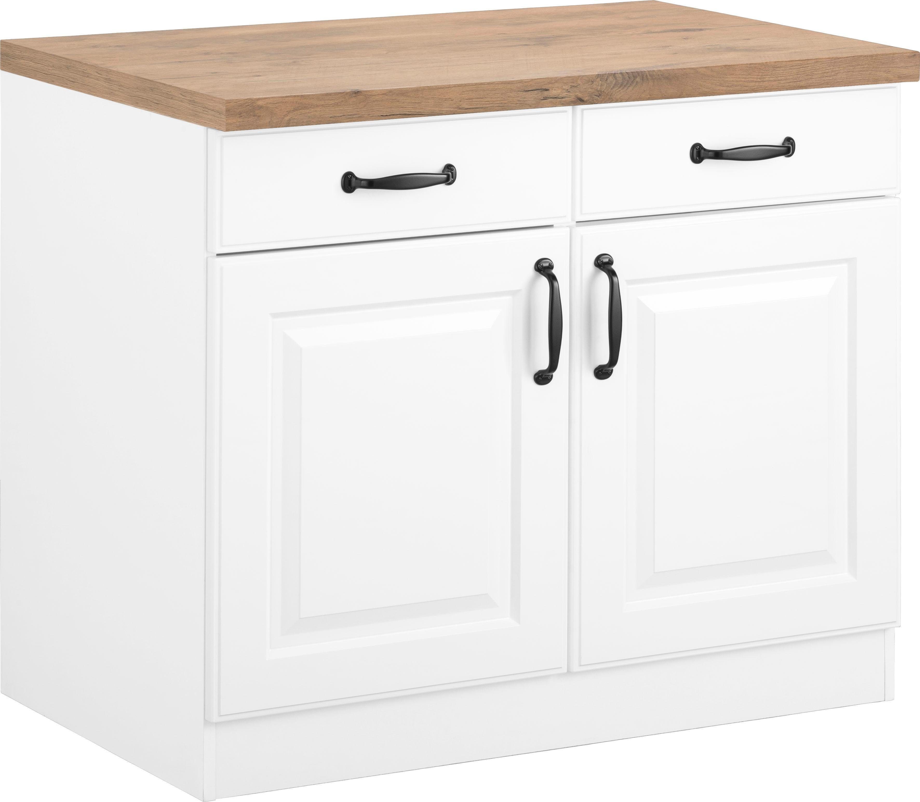 Farbe | Front: Kassette weiß, Korpus: weiß, Arbeitsplatte: Kastelleiche |