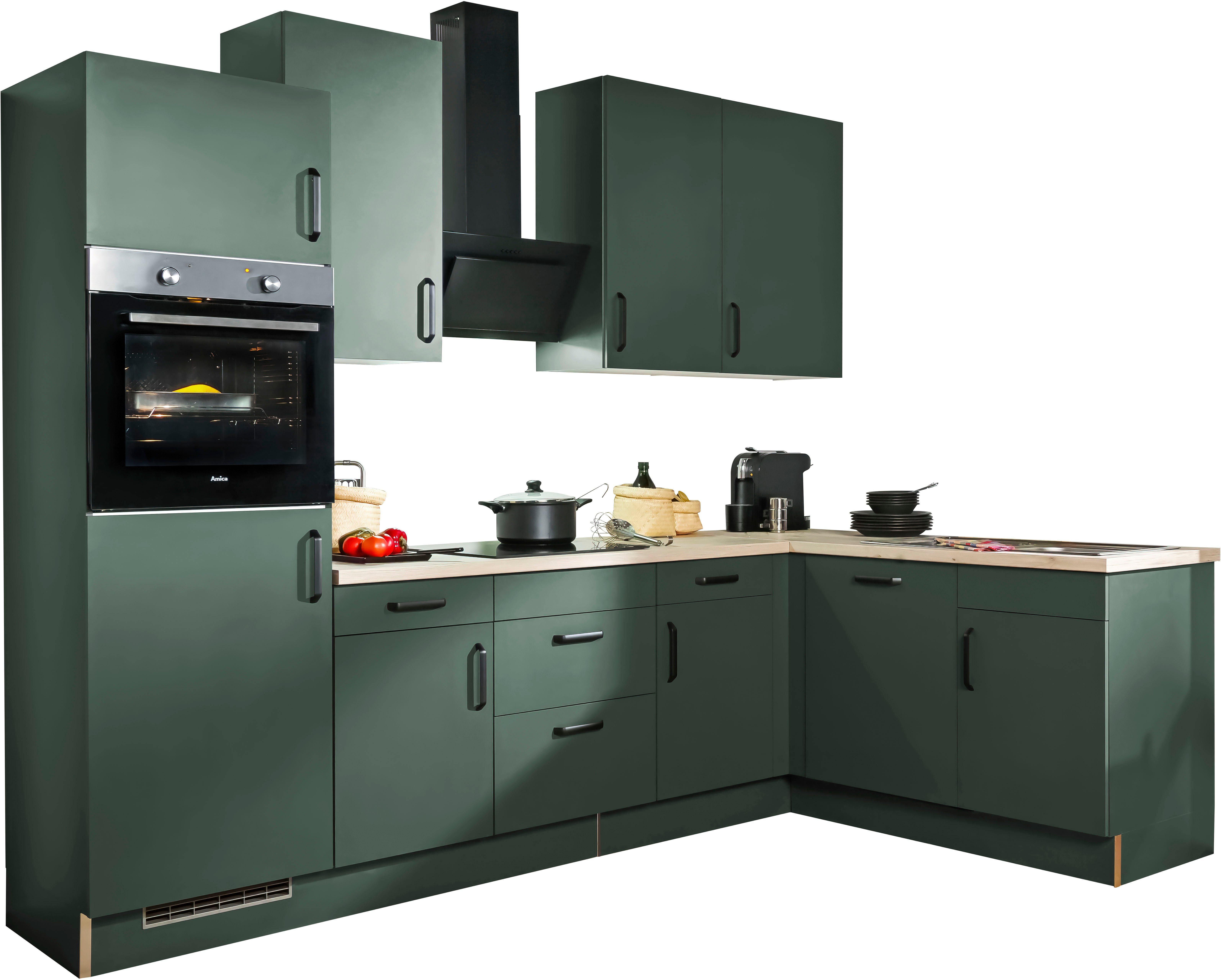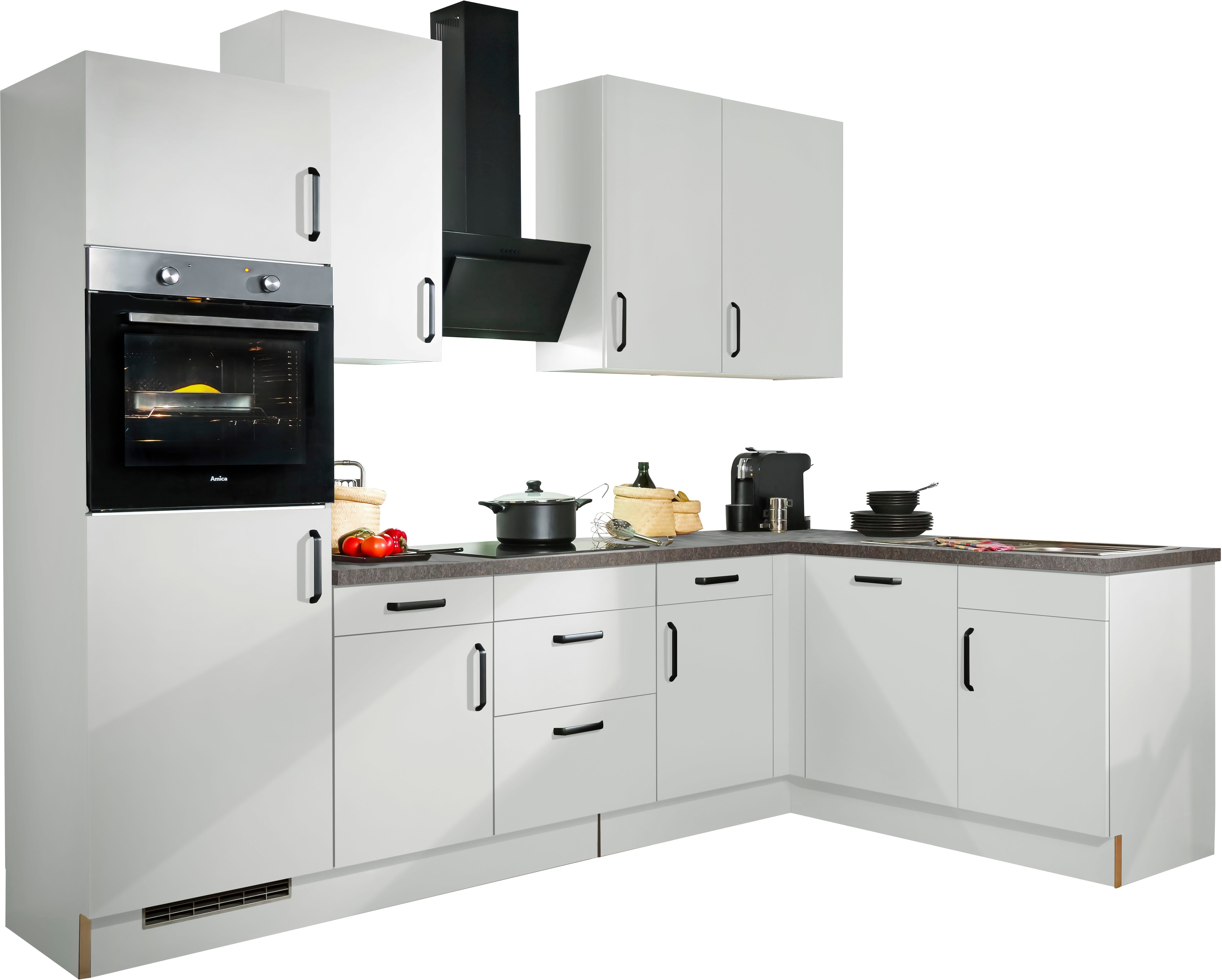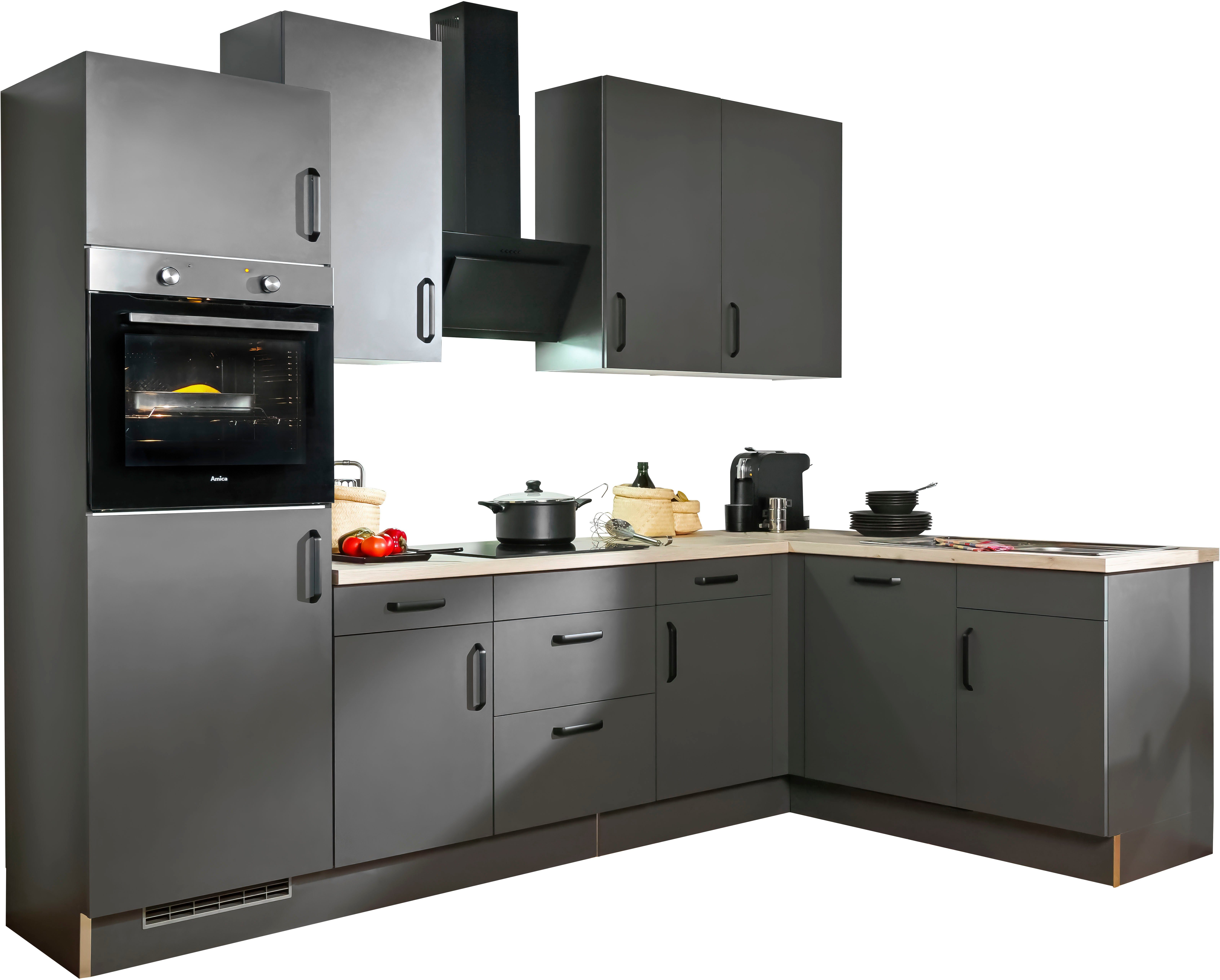 Inkl. Eckpassleiste frontbündig, mit Rücklauf für Geschirrspüler Inkl. Sockelset und Lüftungsgitter Mit Soft-Close-Funktion in Schubkästen & Auszügen Selbstmontage mit Aufbauanleitung |