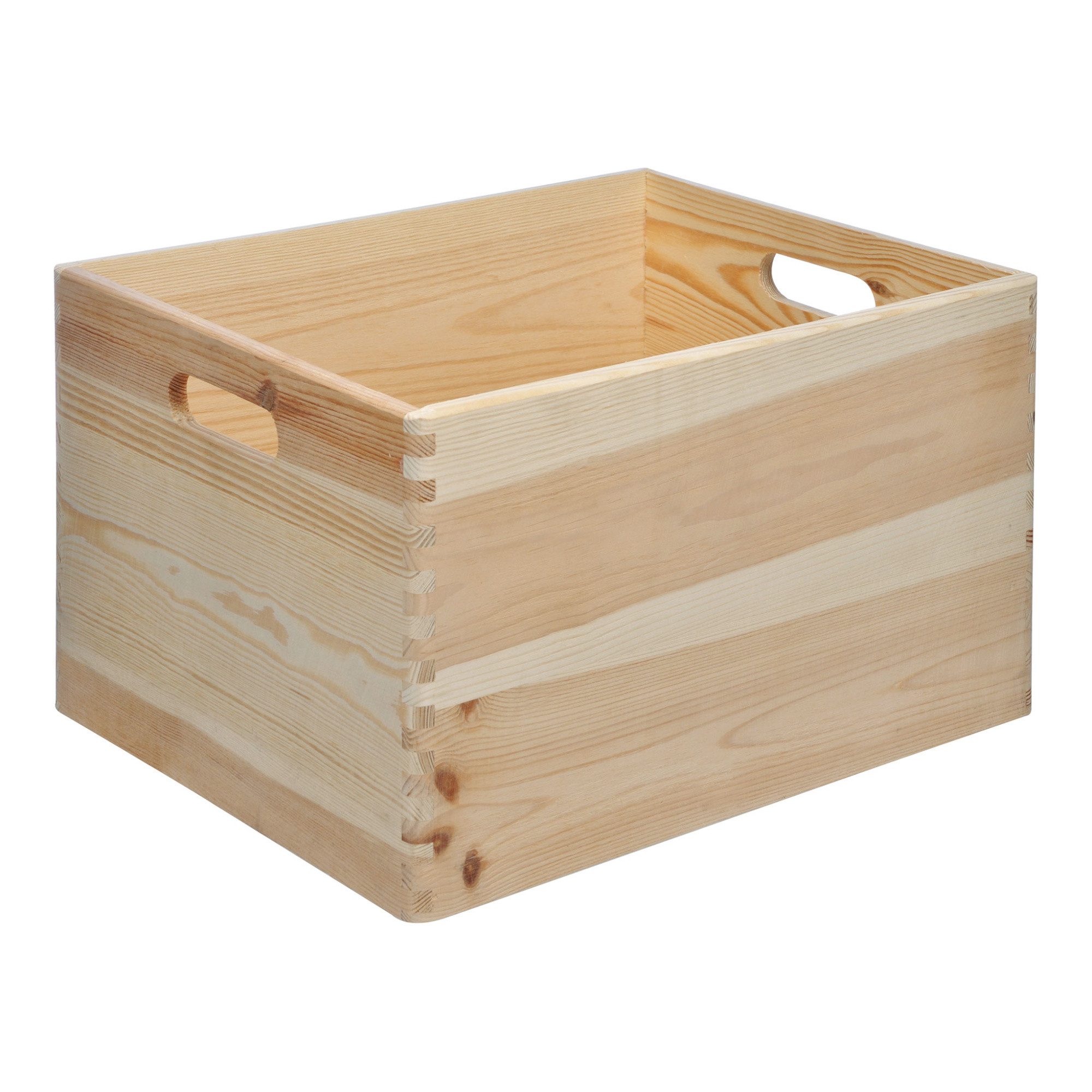 Da das Kiefernholz komplett naturbelassen ist, kann die 400 mm lange, 300 mm breite und 225 mm hohe Holzbox problemlos mit Lack oder Farbe bearbeitet werden, so dass sie auch im Arbeits- oder Kinderzimmer als individuell gestaltete Einrichtung dienen kann. Die sorgfältig verzapften Ecken tragen zur besonderen Optik der hochwertigen Box bei.