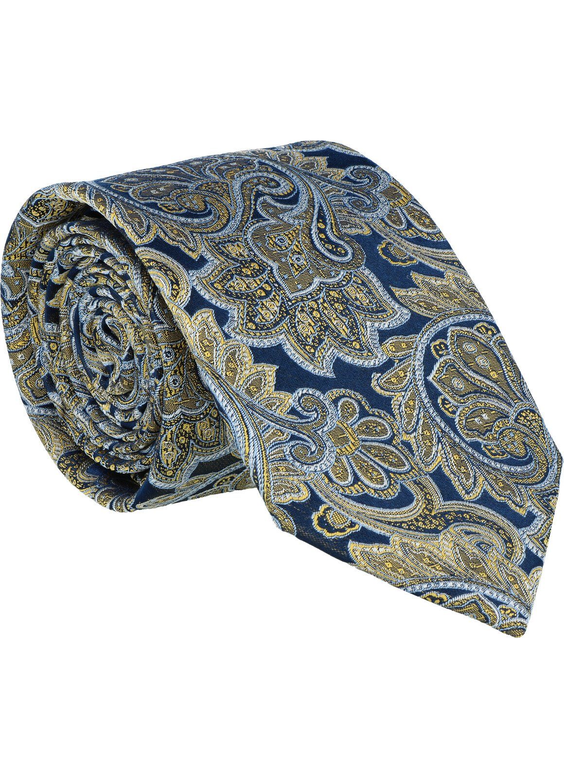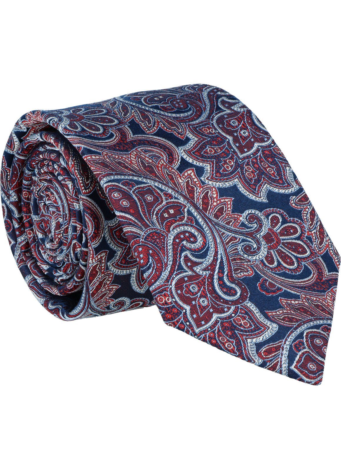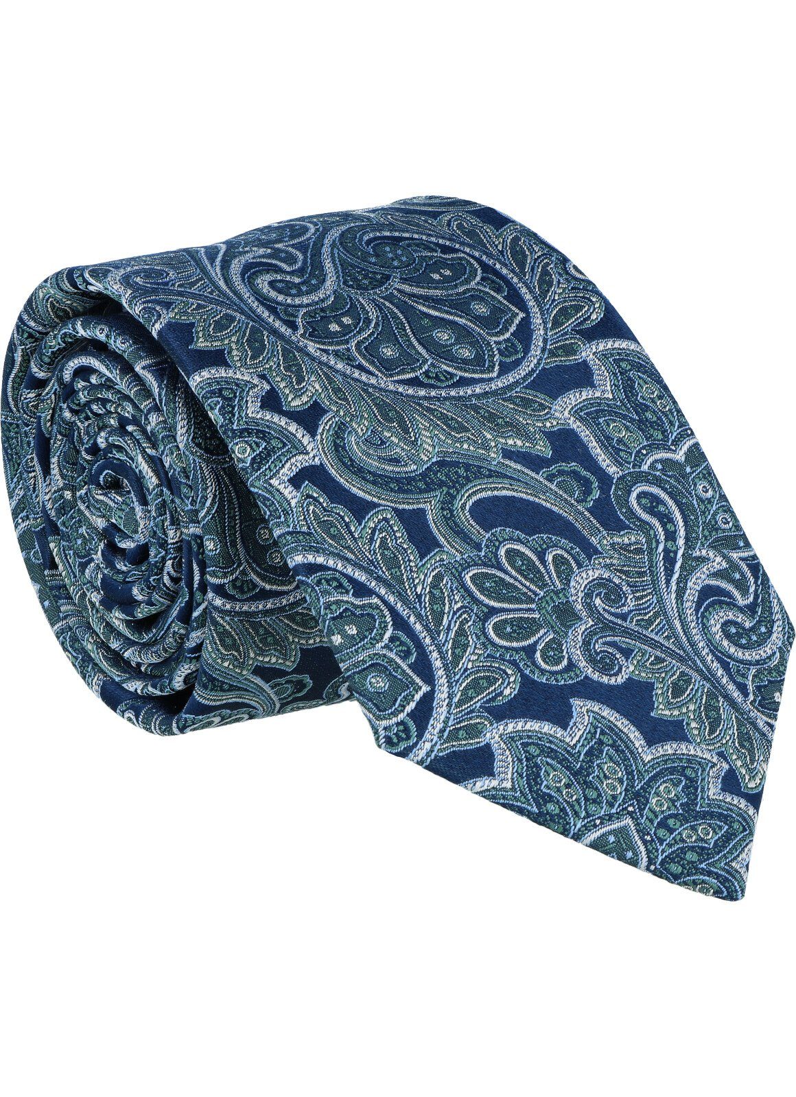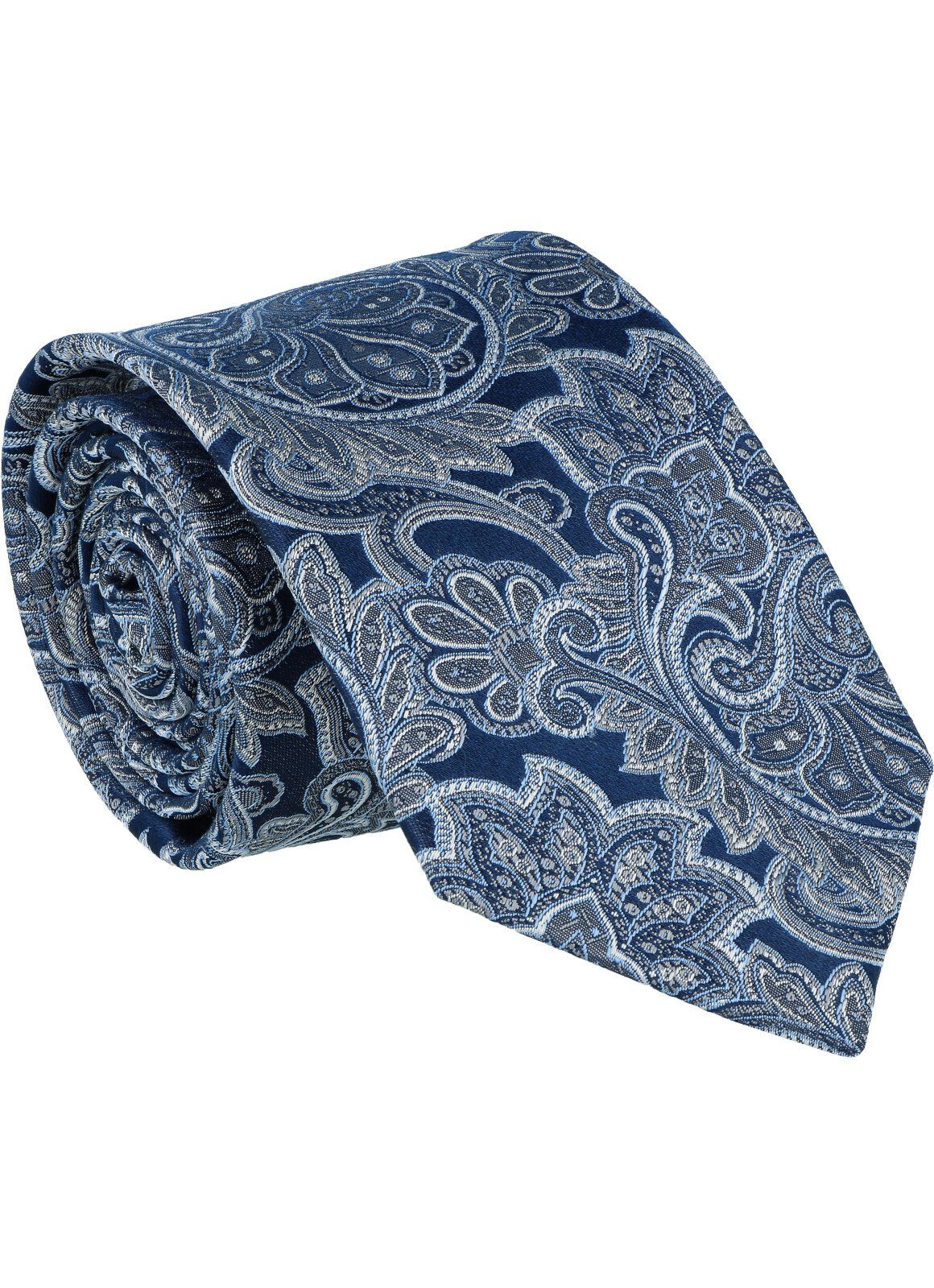 Mit dieser Krawatte erhält das Paisley, als Klassiker unter den Krawattendesigns, eine moderne und zugleich elegante Aussage. Der marinefarbene Fond passt perfekt zu den aktuellen marinefarbenen Anzügen. Kombiniert sind die Farben jeweils mit hellblau und weiß, wodurch die Krawatte vielseitig zu kombinieren ist.