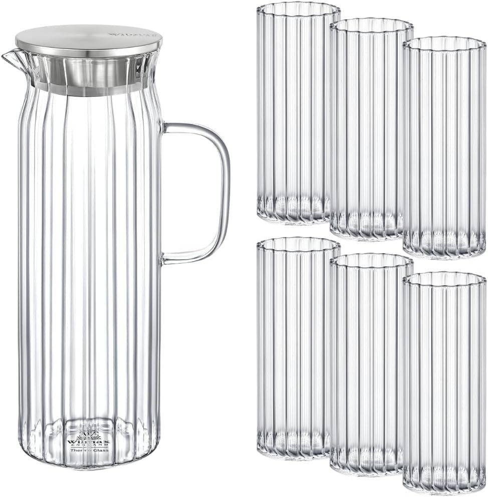 Das Wilmax Gläser- & Karaffen-Set kombiniert 6 elegante Gläser (350 ml) mit einer stilvollen Karaffe (1500 ml) mit Edelstahl-Deckel. Perfekt für stilvolles Servieren.