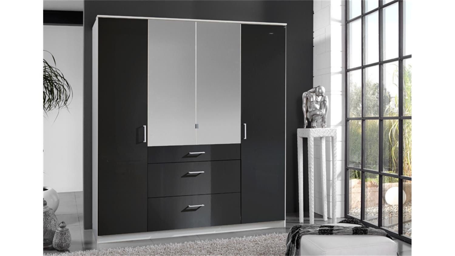 Das Schrankprogramm Clack fällt mit seinen Hochglanzfronten auf und überzeugt durch die gradlinige, moderne Optik. Dieser Kleiderschrank misst 180 cm in der Breite und bietet vier Türen, von denen zwei bespiegelt sind und drei Schubkästen. Er wird mit zwei Kleiderstangen und vier Einlegeböden geliefert. Dieses Schrankprogramm ist auch in weiteren Farben und Ausführungen verfügbar. Bitte schauen Sie in unseren Onlineshop oder fragen Sie unseren Verkauf.