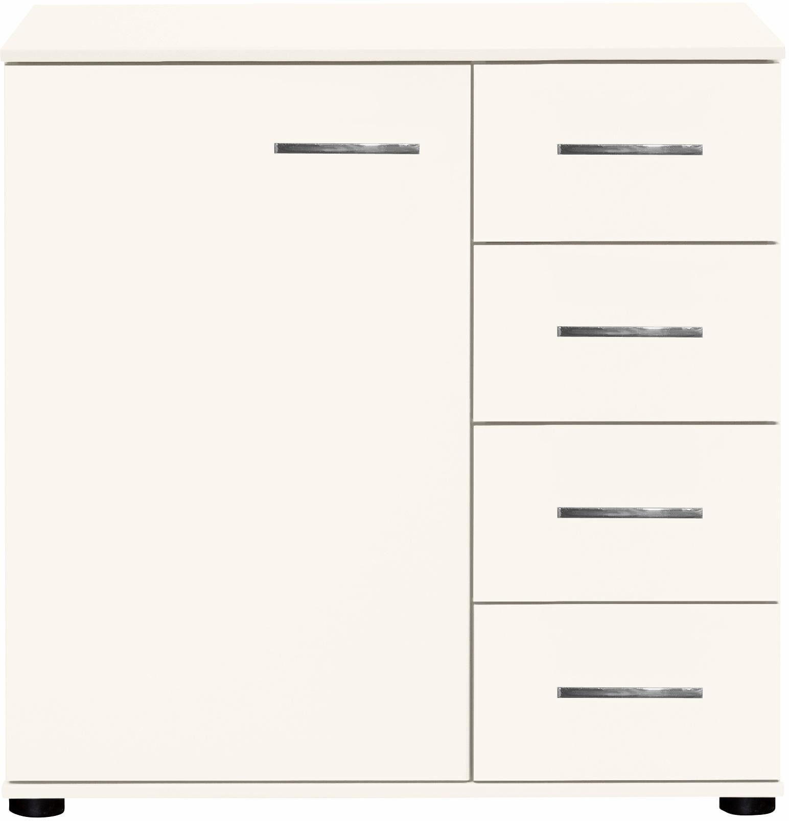 Wissenswertes | Schöne Kombikommode mit pflegeleichte Kunststoffoberfläche. Chromfarbene Kunststoffgriffe. Beschläge aus Metall. Schubkästen auf Metalllaufleisten. Innendekor Leinen grau. Details: