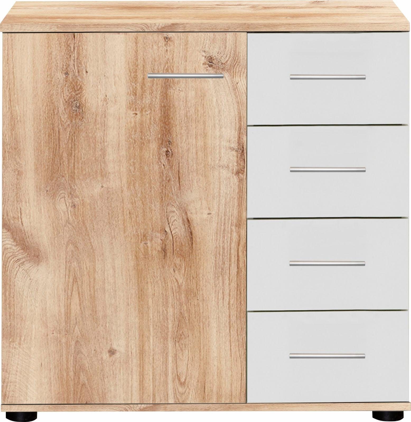 Wissenswertes | Kombikommode mit 1 Tür und 4 Schubkästen. Hinter der Tür ein Einlegeboden. Schubkasteninnenmaße (B/T/H): 35/28/9 cm. Gesamtmaße B/T/H: 81/41/83 cm. Beschläge aus Metall. Alufarbene Kunststoffgriffe. Schubkästen auf Metalllaufleisten. Details:
