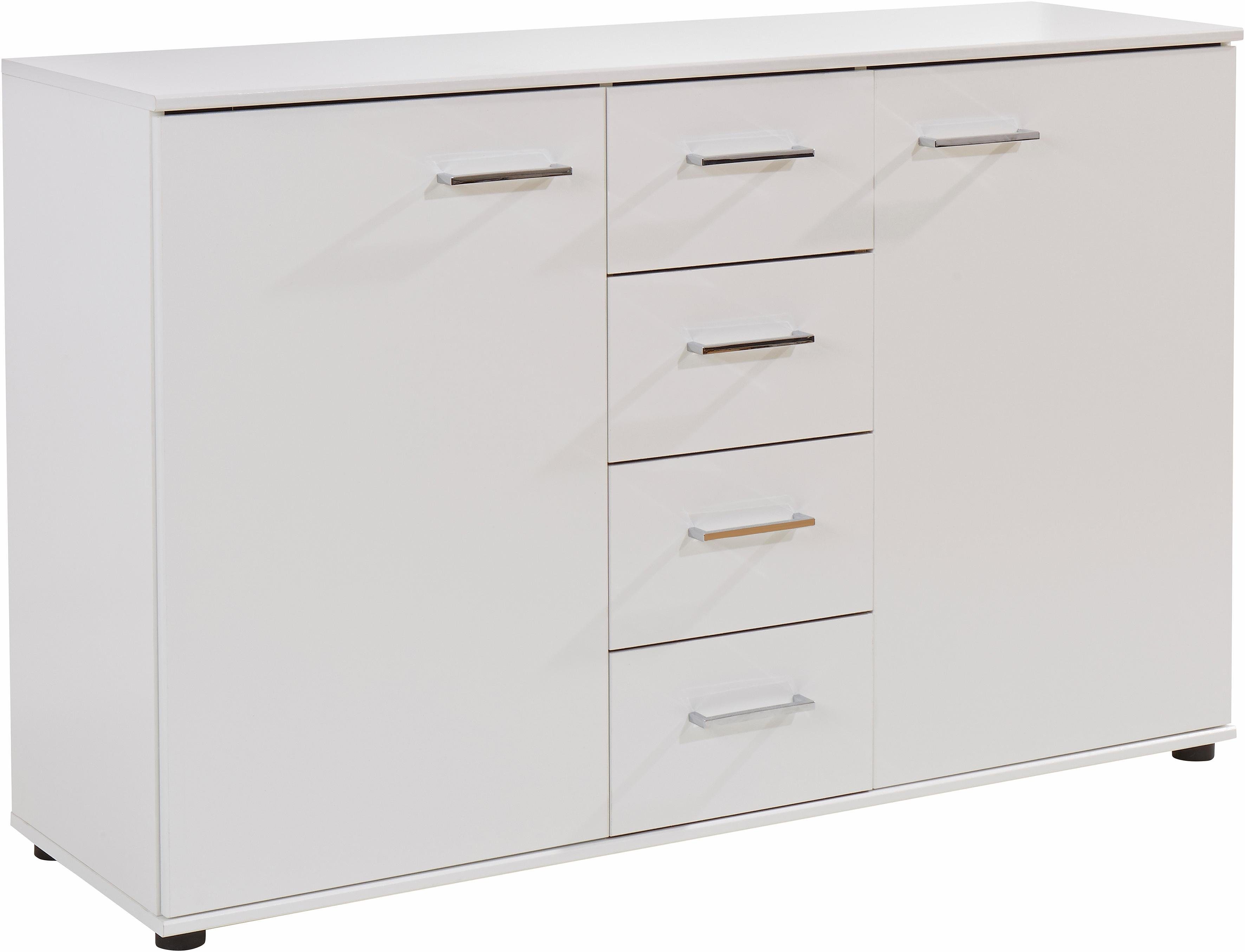 Wissenswertes | Modernes Schlafzimmer mit glänzenden chromfarbenen Ausleistungen. n 3 Farben: struktureichefarben hell, plankeneichefarben oder weiß. Pflegeleichte Kunststoffoberfläche. Innendekor Leinen grau. Beschläge Scharniere und Kleiderstangen aus Metall. Griffe aus chromfarbenem Kunststoff. Kommode mit 2 Türen und 4 Schubkästen (Innenmaße B/T/H: je 51/34/20 cm). Hinter den Türen je 1 Einlegeboden. Innendekor Leinen grau. Schubkästen auf Metalllaufleisten. Griffe aus chromfarbenem Kunststoff. Gesamtmaße (B/T/H): 130/41/83 cm. Details: