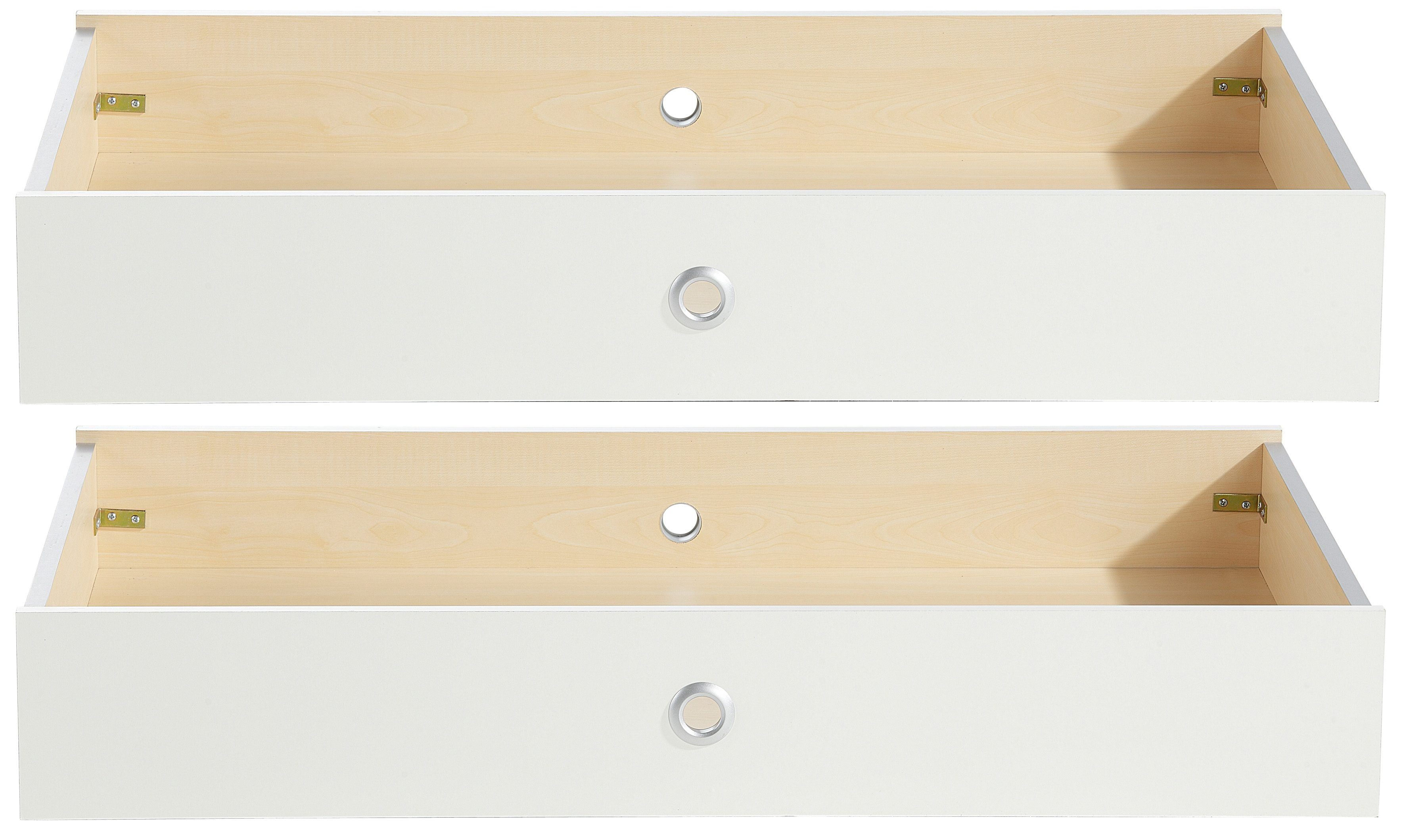 Wissenswertes | Tolles Jugendzimmerprogramm in Weiß mit dekorativen Aufleistungen. Pflegeleichte Kunststoffoberfläche. Innendekor Leinen grau. Beschläge aus Metall. Griffe aus Metall. Für zusätzlichen Stauraum. Mit praktischen Griffmulden. Auf Rollen. Innenmaße (B/T/H): je 95/56/10 cm. Gesamtmaße (B/T/H): je 100/60/16 cm. Всеs ca.-Maße. Mit Aufbauanleitung. |