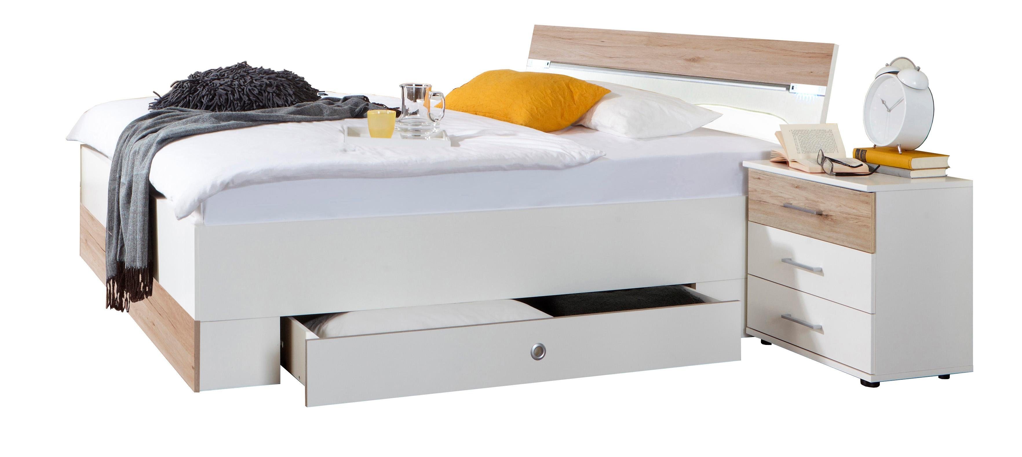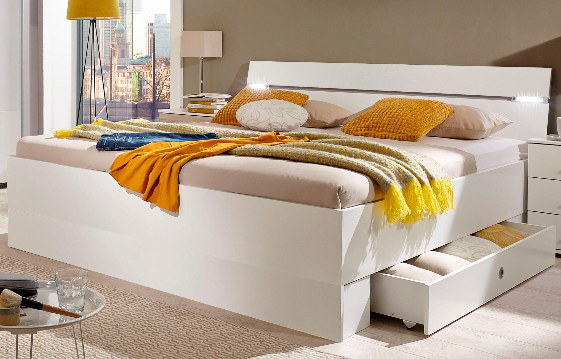 Wissenswertes | Modernes schlichtes Bett mit integrierter LED-Beleuchtung am Kopfteil. Ausgestattet mit zusätzlichen Bettschubkästen für mehr Stauraum im Schlafzimmer. Details: