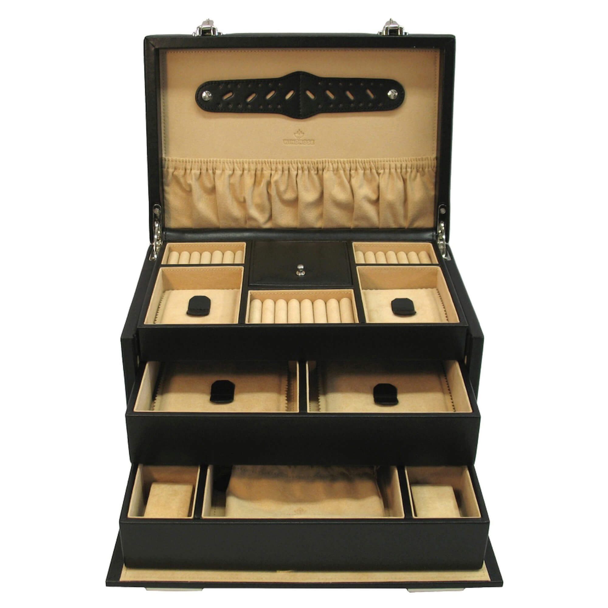 Entdecken Sie den eleganten Uhrenkoffer in Schwarz von Windrose Ambiance, der nicht nur durch sein stilvolles Design, sondern auch durch seine hochwertige Verarbeitung besticht. Dieser Koffer ist die ideale Aufbewahrungslösung für bis zu vier Uhren und vereint Funktionalität mit einem Hauch von Luxus. * Material: Echtholz mit einem edlen Überzug aus fein strukturiertem Rindleder, das für Langlebigkeit sorgt. * Innenausstattung: Gepolstert mit italienischem Samt, der Ihre Uhren sanft schützt und gleichzeitig einen luxuriösen Look bietet. * Verschluss: Ausgestattet mit einem abschließbaren Clipverschluss, der für zusätzliche Sicherheit sorgt. * Platzangebot: Mit vier Etagen, die ausreichend Platz für Ihre wertvollen Zeitmesser bieten. Mit einem Gewicht von 3,80 Kilogramm und einem Volumen von 12,6 Litern ist dieser Koffer nicht nur praktisch, sondern auch ein echter Blickfang. Perfekt für Sammler und Liebhaber von feinen Uhren, die Wert auf Stil und Qualität legen. Der Windrose Ambiance Uhrenkoffer in Schwarz ist die perfekte Ergänzung für Ihr Zuhause oder als stilvolles Geschenk für einen besonderen Menschen.