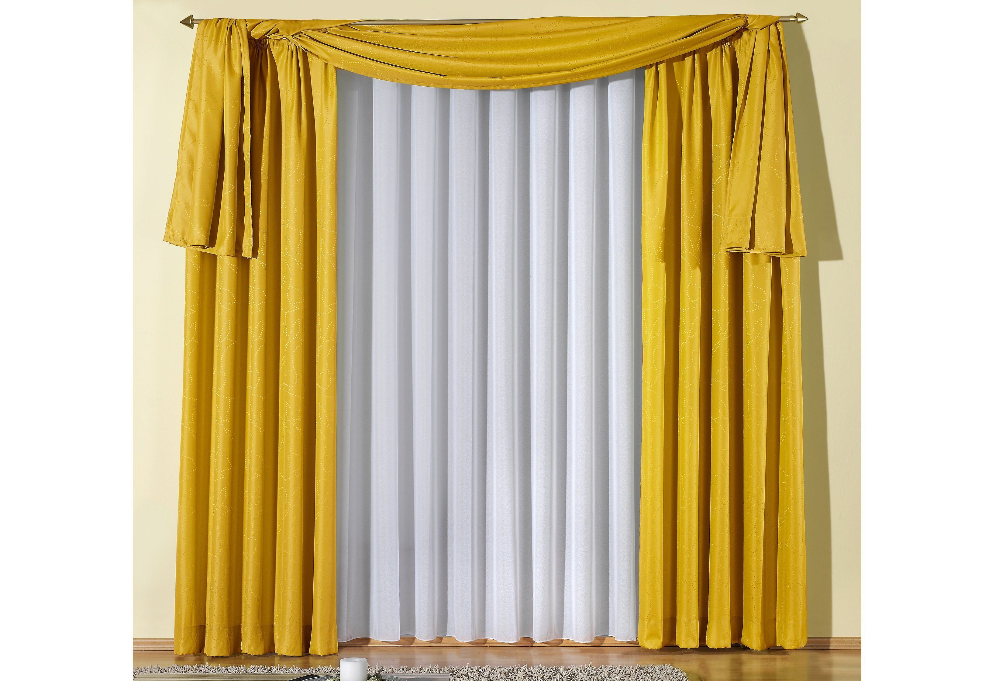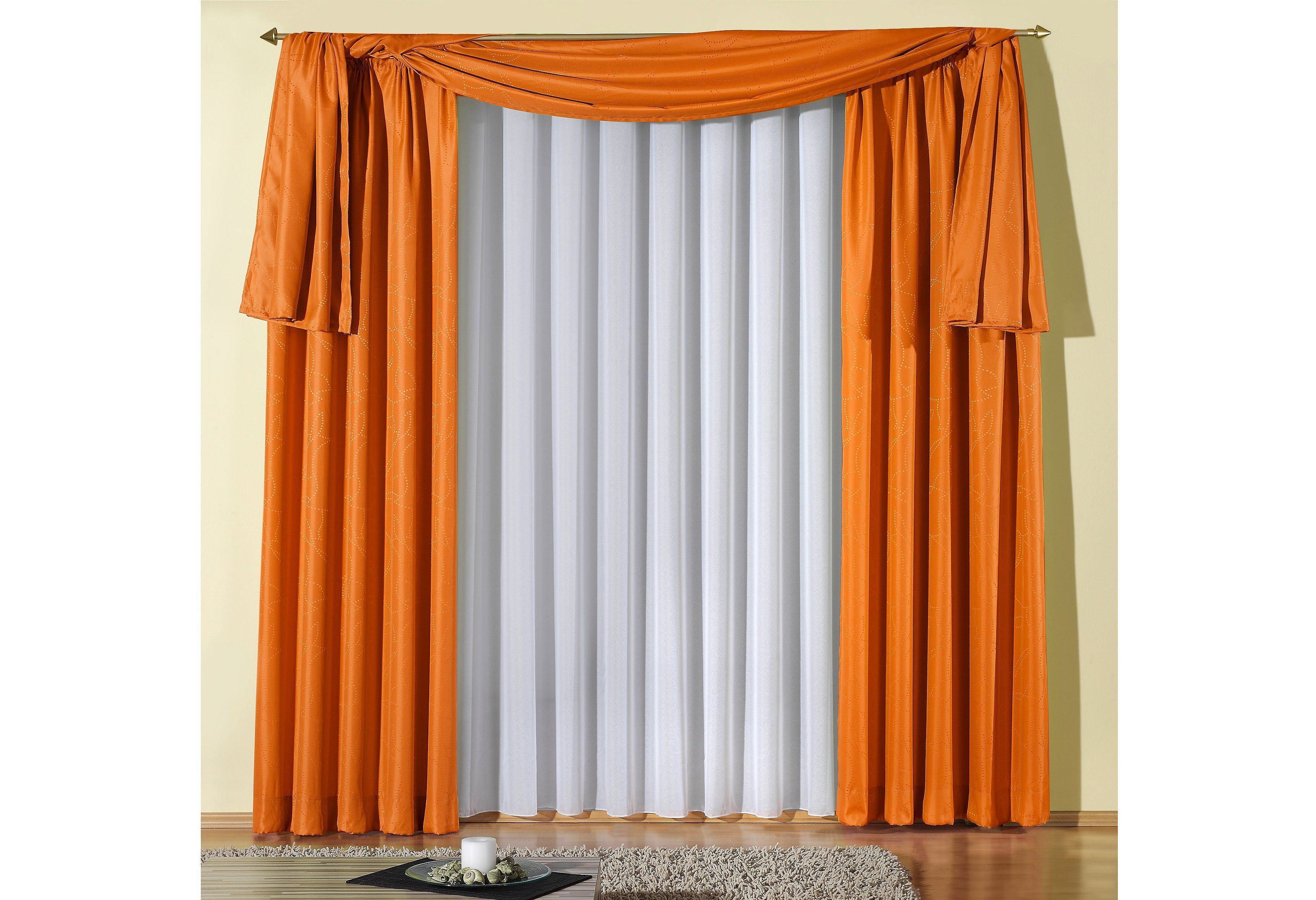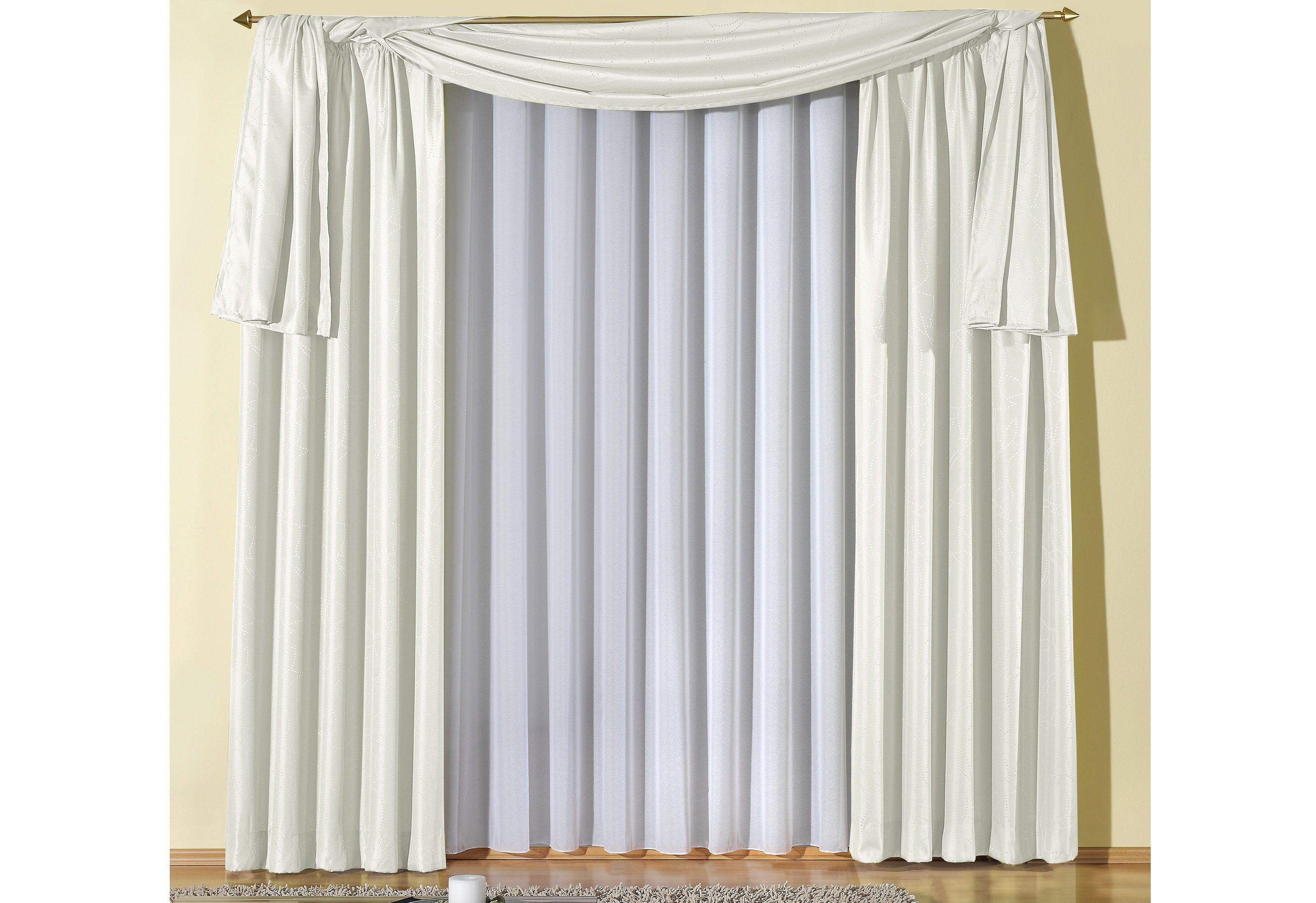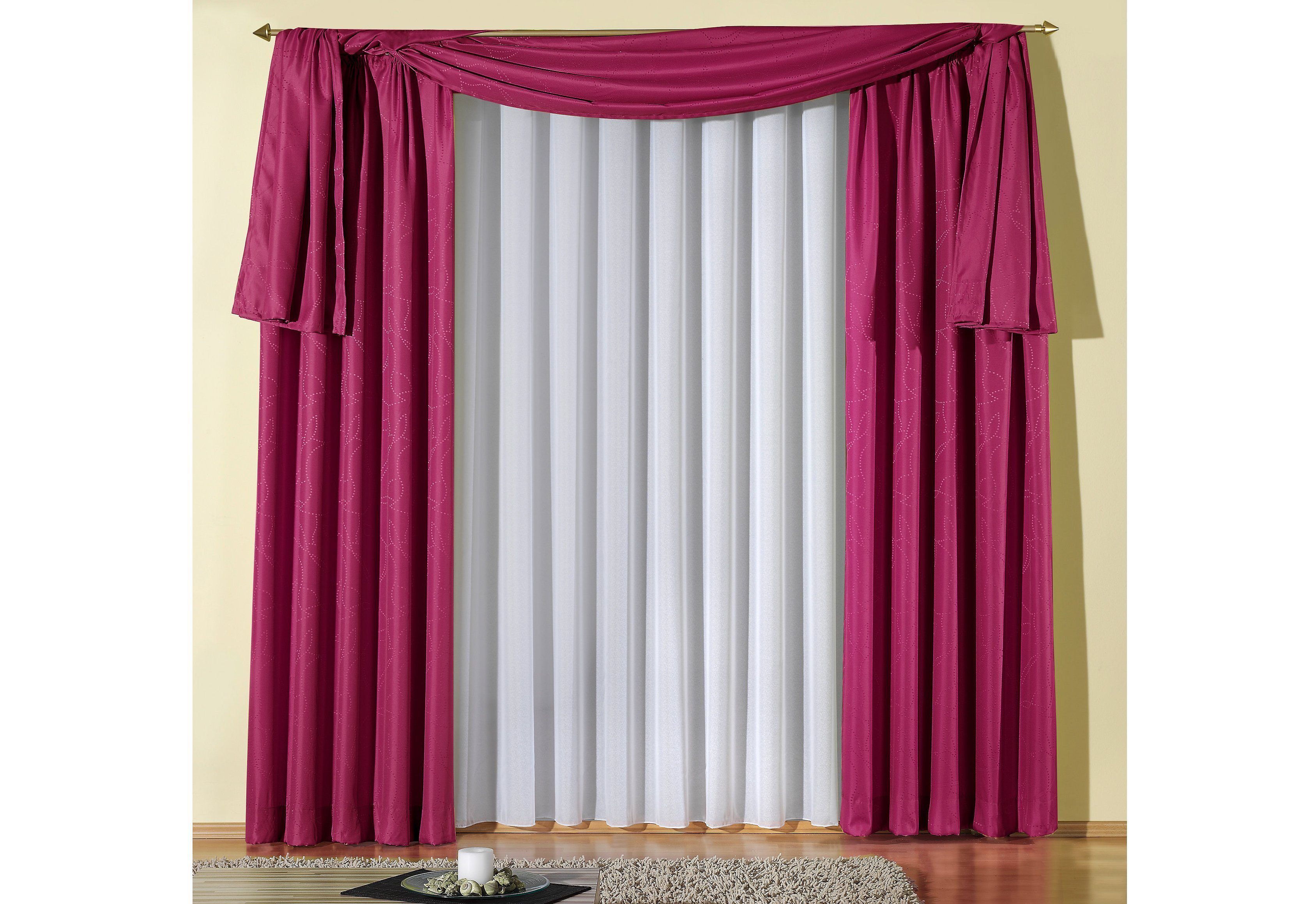Hinweis Dekoration | Am Fenster fertig dekoriert, reduziert sich die Breite um ca. die Hälfte. Die angegebenen Maße sind Stoffmaße. |