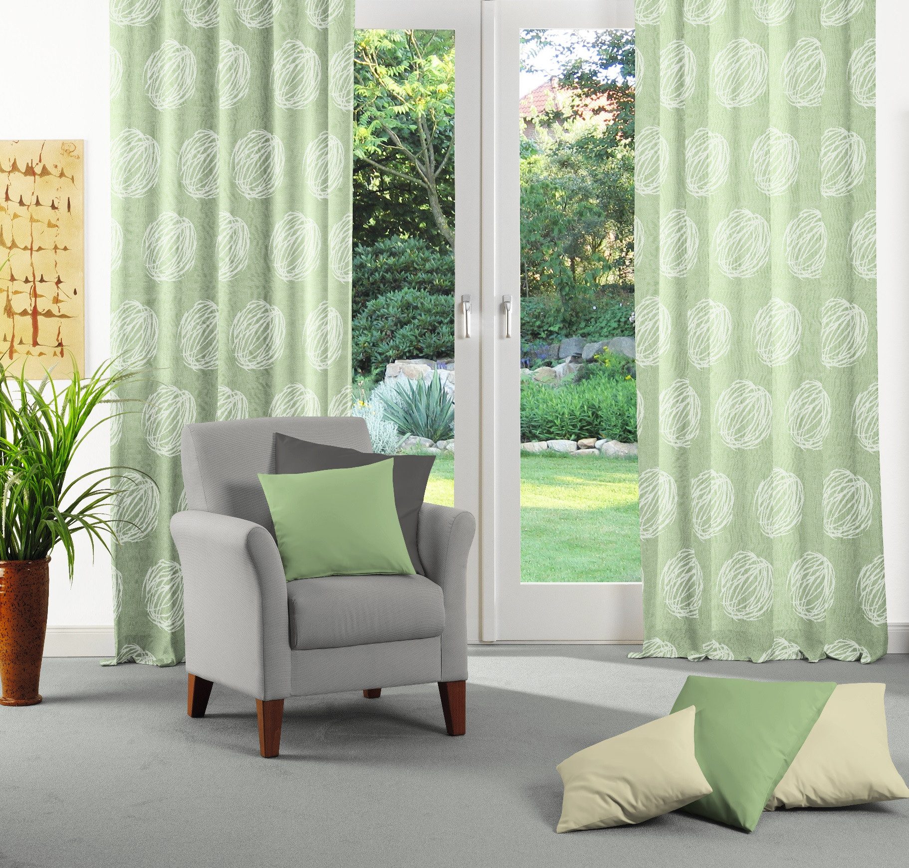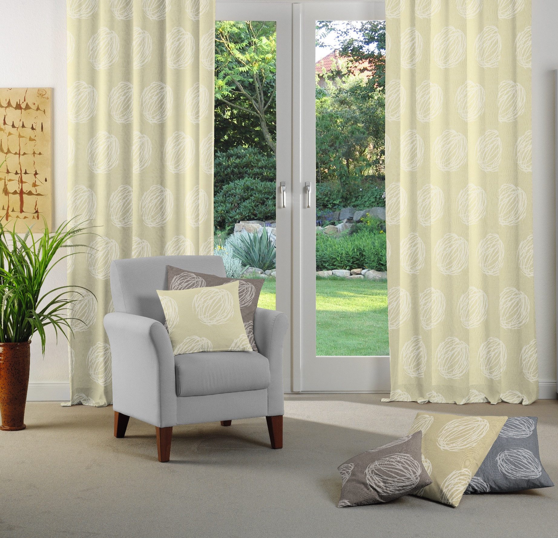 Hinweis Dekoration | Am Fenster fertig dekoriert, reduziert sich die Breite um ca. die Hälfte. Die angegebenen Maße sind Stoffmaße. |