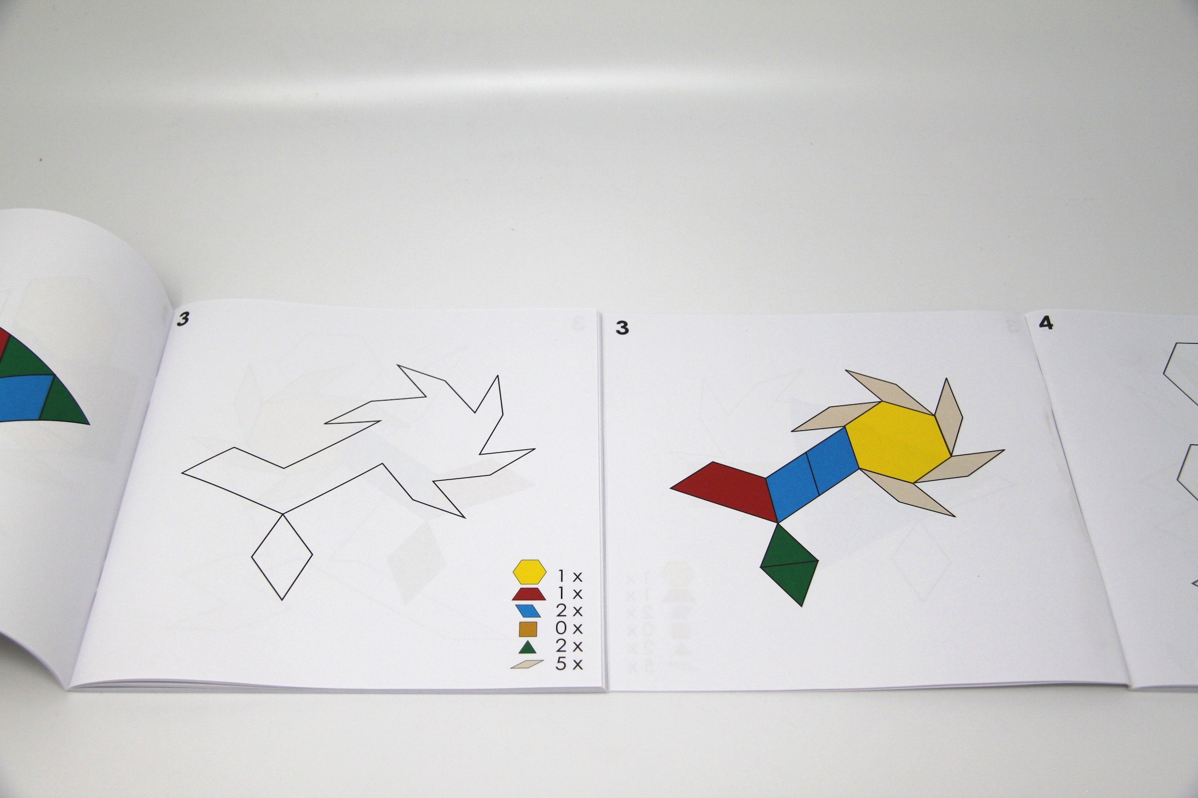 Funktionen | Ergänzung zu unseren Geometrischen Legeplättchen (Pattern Blocks) (EAN: 4260414066436) 25 Vorlagen in Originalgröße zum Nachlegen mit vorgegebener Teile-Anzahl und Lösung auf der Rückseite. Aus 100% recyceltem Papier. |