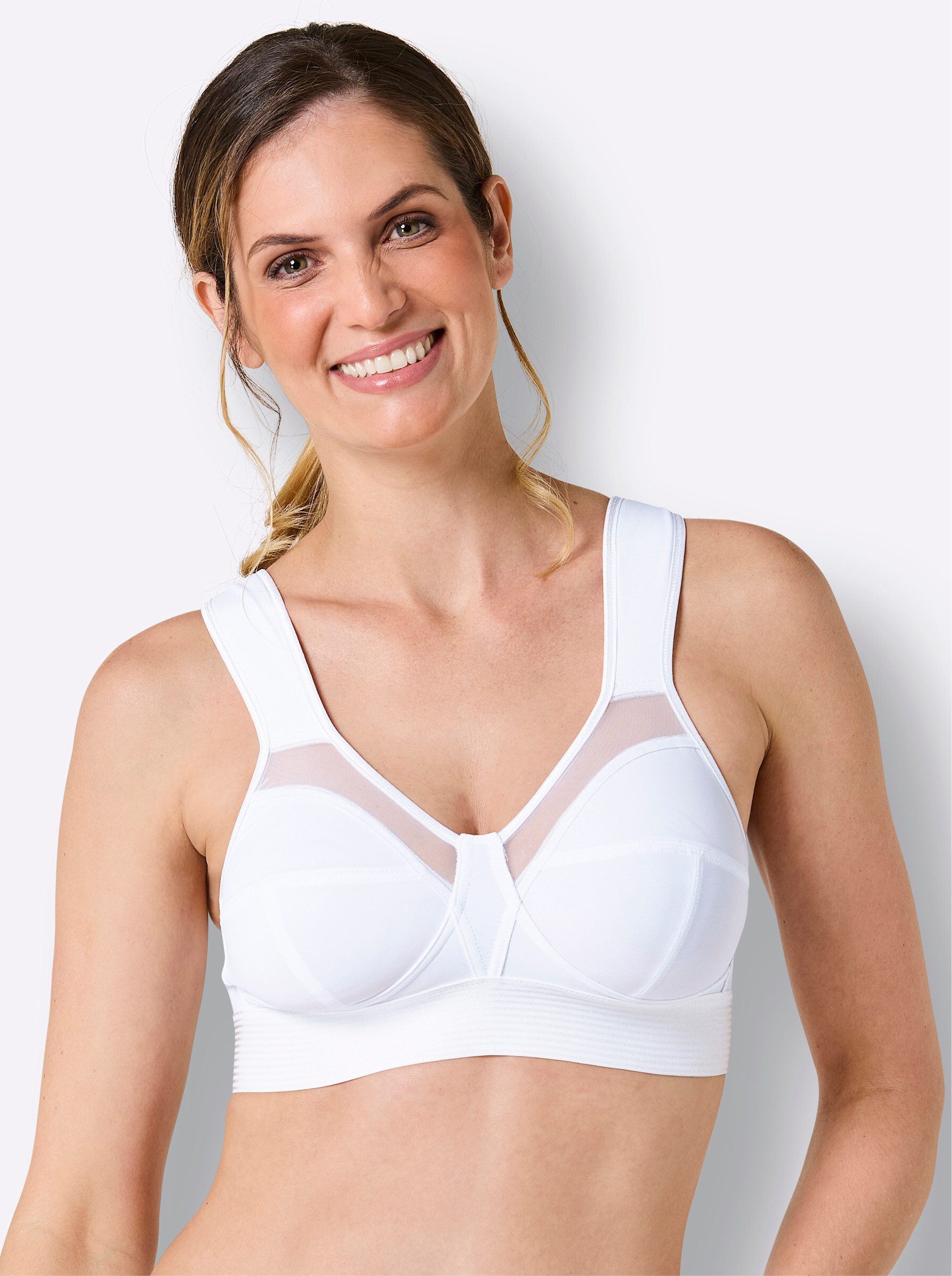 Zaubert eine schöne Büste: Entlastungs-BH ohne Bügel von wäschepur. In unserer Form SAPHIR. Mit 3-geteilten Cups. Schön: der Mesh-Einsatz entlang des Ausschnitts. Breite, wattierte Komfortträger, die sich im Rücken verstellen lassen. Gestreiftes Unterbrustband. Mit recyceltem Polyamid.