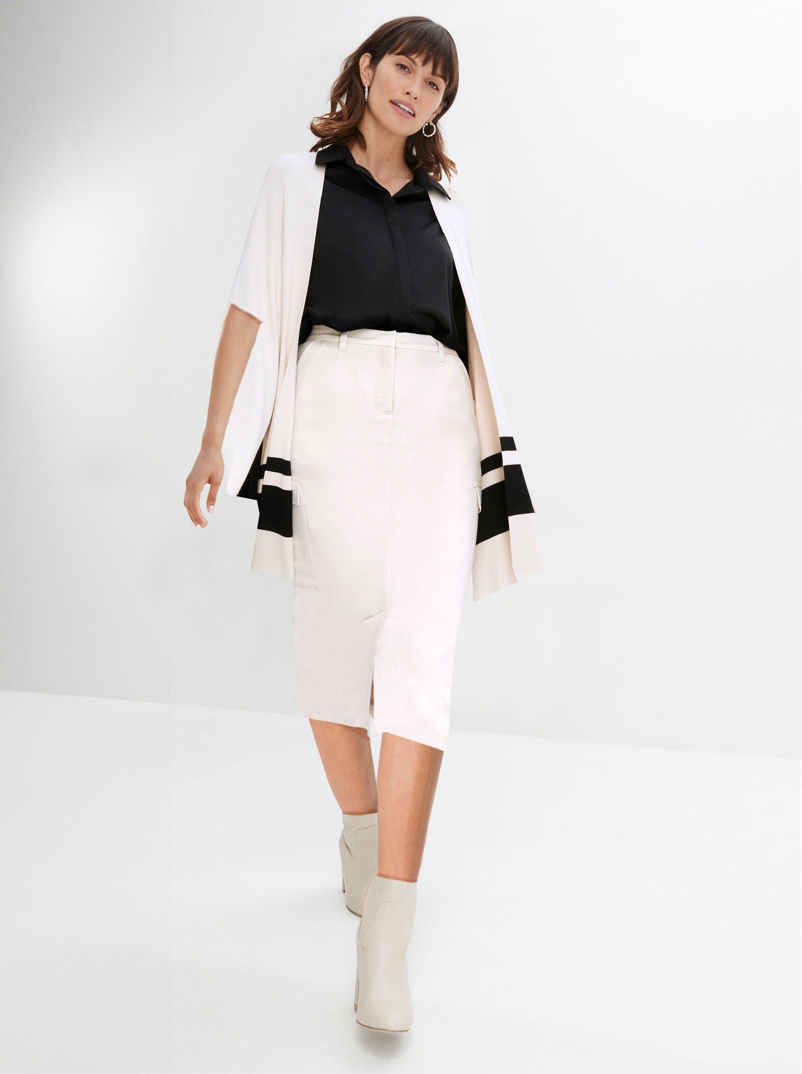 Kontraststark inszenierte Strickjacke in topaktueller, weiter Oversize-Form und hochwertigem, formstabilem Milano-Strick. Offen getragen oder mit dem Strick-Bindegürtel geschlossen – Sie haben die Wahl. Mit V-Ausschnitt und kurzen Raglan-Ärmeln. 2 Gürtelschlaufen seitlich.