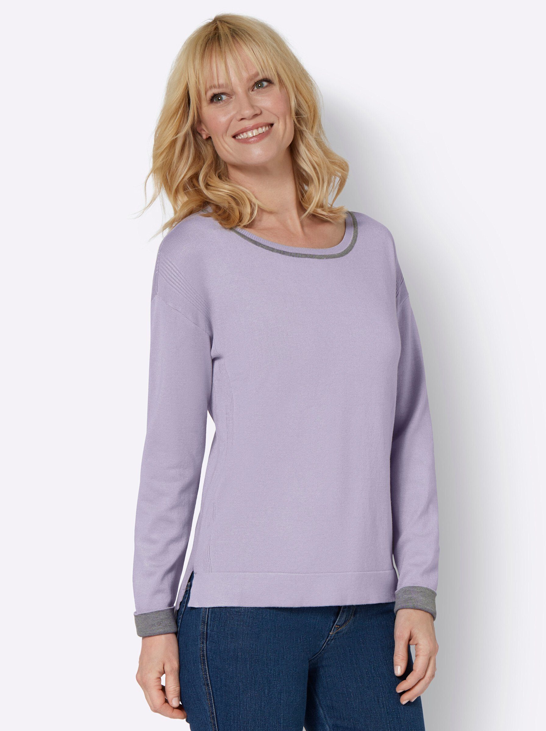 Wow, mit Viskose! Der Pullover verwöhnt mit schmeichelweicher Feinstrick-Qualität. Das längere Rückteil umspielt die Figur. Mit flotten Kontraststreifen an Ärmelbündchen und Saum.