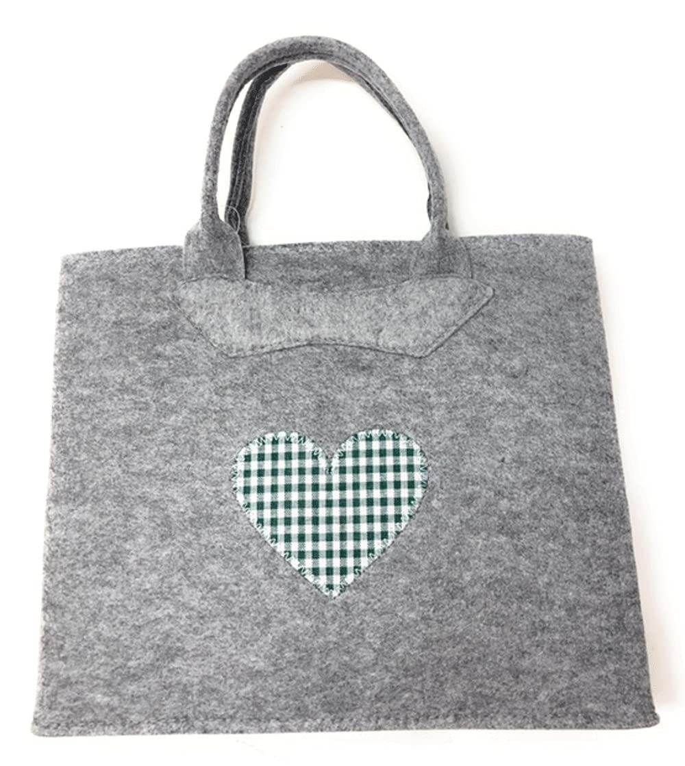 Trachtentasche hellgrau aus Filz mit Henkel. Das süße grün karierte Herz ist ein Hingucker. Diese schöne rechteckige Trachtentasche vervollständigt ihr Trachtenoutfit und ist auch alltagstauglich. 36x30cm