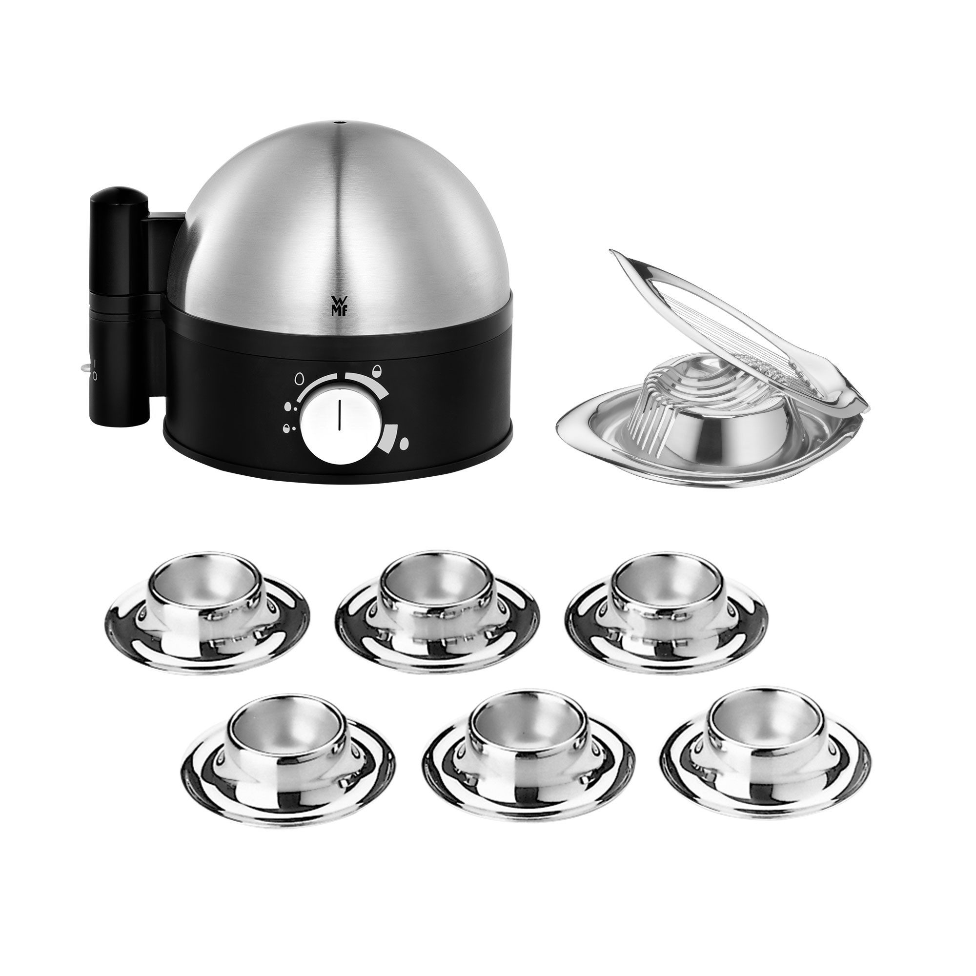 Der eine mag sein Frühstücksei hart-, der andere weichgekocht. Kein Problem: Der Eierkocher Stelio von WMF bereitet bis zu 7 Eier zur gleichen Zeit zu - und das unter einer Kuppel aus stilvollem, gebürstetem Cromargan®: Edelstahl Rostfrei 18/10. Die ausgeklügelte Elektronik überwacht zuverlässig den gewünschten Gargrad mehrerer Eier gleichzeitig, von hart- über mittel- bis weichgekocht. Erweiterte Funktionen wie der separate Ein-/Ausschalter, ein akustisches Signal am Ende des Kochvorgangs und die praktische Kabelaufwicklung runden das Kocherlebnis ab. Die Stelio Kollektion von WMF verbindet seidenmatt schimmernde Oberflächen in edlem Cromargan®: Edelstahl Rostfrei 18/10 mit schlichten schwarzen Akzenten. Von der Kaffeemaschine und der Kaffeemühle über einen Wasserkocher, einen Mixer oder eine Zitruspresse: Die Geräte der Frühstücksserie fügen sich nahtlos in jede Küche ein.