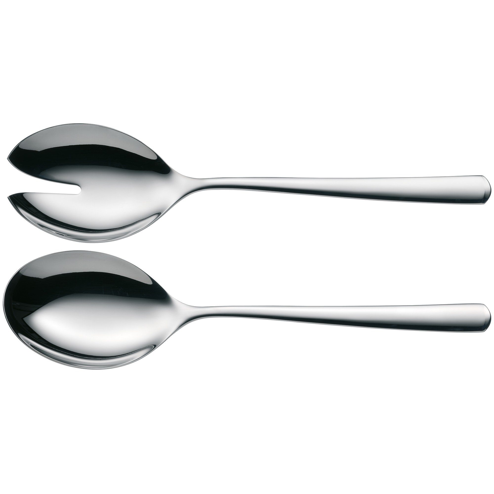 Das Salatbesteck ist stets zweiteilig, wobei seine flachen, äußerst großzügig gestalteten Laffen die leichte Aufnahme des Salats ermöglichen und zwar so, dass überschüssiges Dressing vor dem Servieren leicht abtropfen kann. Die langen Stiele des Bestecks sorgen für bequemes Hantieren und verhindern zugleich, dass es in die Salatschlüssel rutscht.