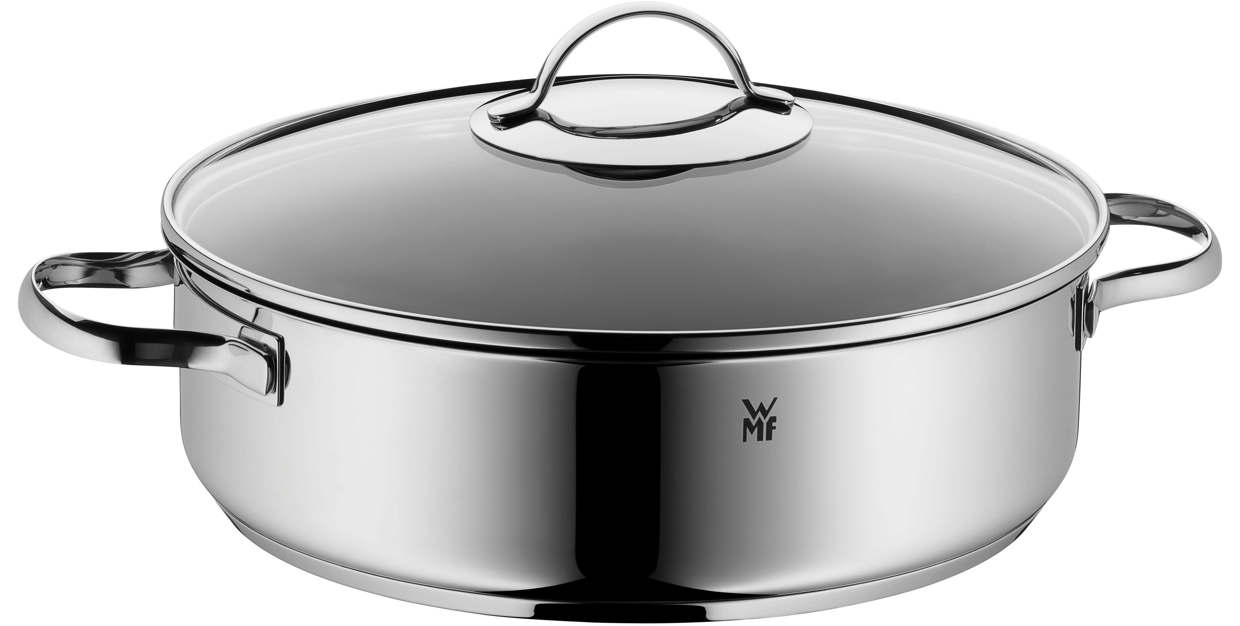 Ob beim Braten oder beim Schmoren, ob auf dem Herd oder im Backofen: Die vielseitig einsetzbare, elegante Servier-Schmorpfanne mit Glasdeckel und 28 cm Durchmesser von WMF meistert nicht nur die leckersten Pfannen- und Schmorgerichte, sondern macht auch beim Servieren der Köstlichkeiten eine sehr gute Figur auf dem Tisch. Mit den beiden seitlichen Griffen ist sie dazu besonders sicher und einfach zu transportieren, der breite Schüttrand sorgt für tropffreies Abgießen von Flüssigkeiten. Damit beim Anbraten nichts anbrennen kann, verfügt die große Pfanne aus strapazierfähigem Cromargan®: Edelstahl Rostfrei 18/10 über die hochwertige Durit Select Pro Antihaftversiegelung, die zudem auch die Reinigung erleichtert. Der TransTherm®-Allherdboden beindruckt mit optimaler Wärmeverteilung und -speicherung und ermöglicht damit energiesparendes Kochen auf jedem Herd, natürlich inklusive Induktionsherden.