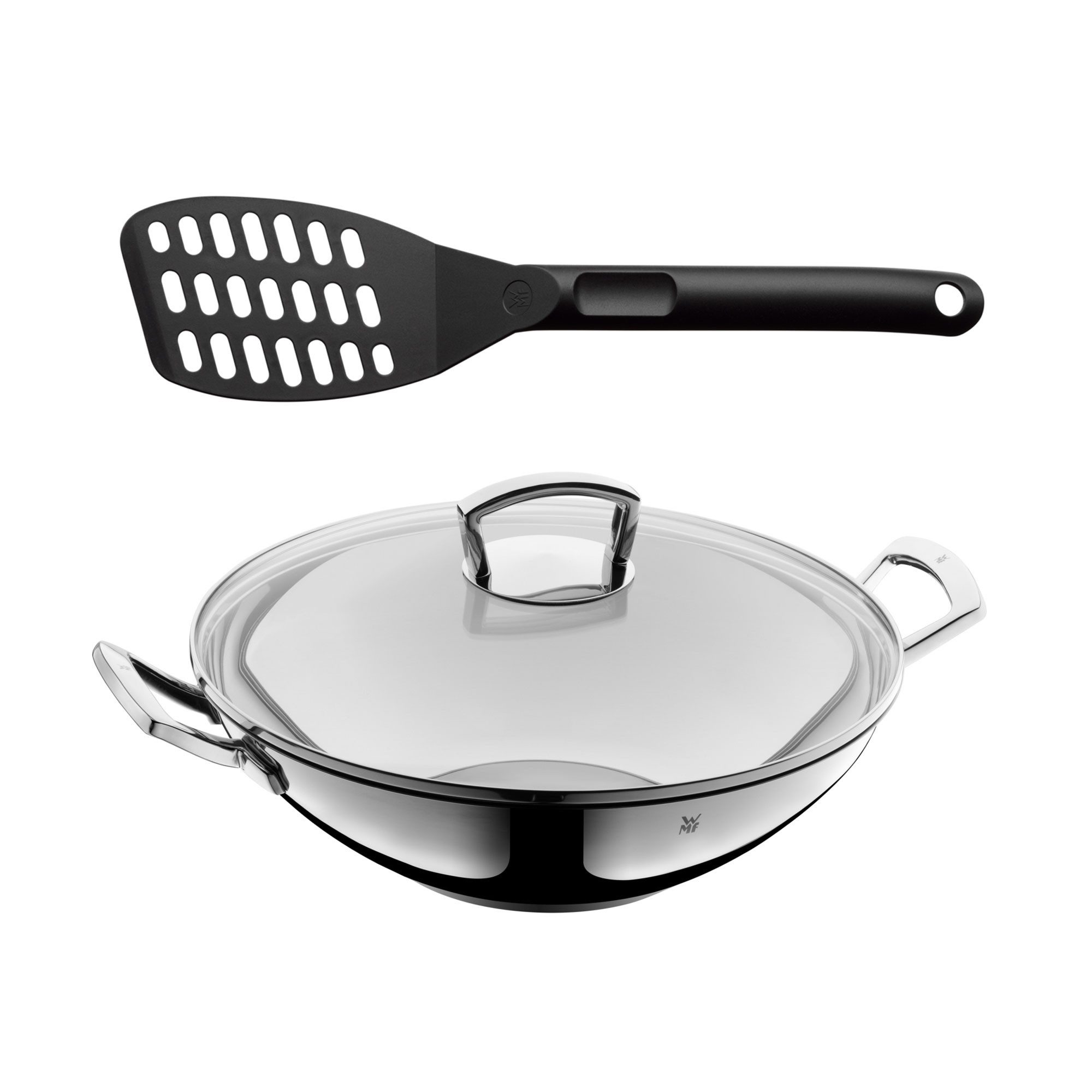 Die hohe, kugelig gewölbte Pfanne mit zwei gegenüberliegenden Griffen ist Topf, Dampfgarer und Fritteuse in einem und zählt in Asien zu den wichtigsten Kochutensilien. Und auch wir lieben den Wok: Mit ihm gelingen nicht nur stilecht asiatische Gerichte, darin können Sie auch jede Art von Gemüse, Fleisch und Fisch dämpfen, schmoren und dünsten. Die bekannteste Garmethode ist freilich das Pfannenrühren, wenn unter ständigem Rühren die Zutaten kurz und scharf angebraten werden. Ein Deckel hält beim Dünsten den Dampf im Wok, hochwertige Materialien leiten die Wärme gleichmäßig ins Innere des Woks weiter und speichern sie. WMF Woks dürfen mit ihrem stilvollen Design zum Servieren direkt auf den Tisch.