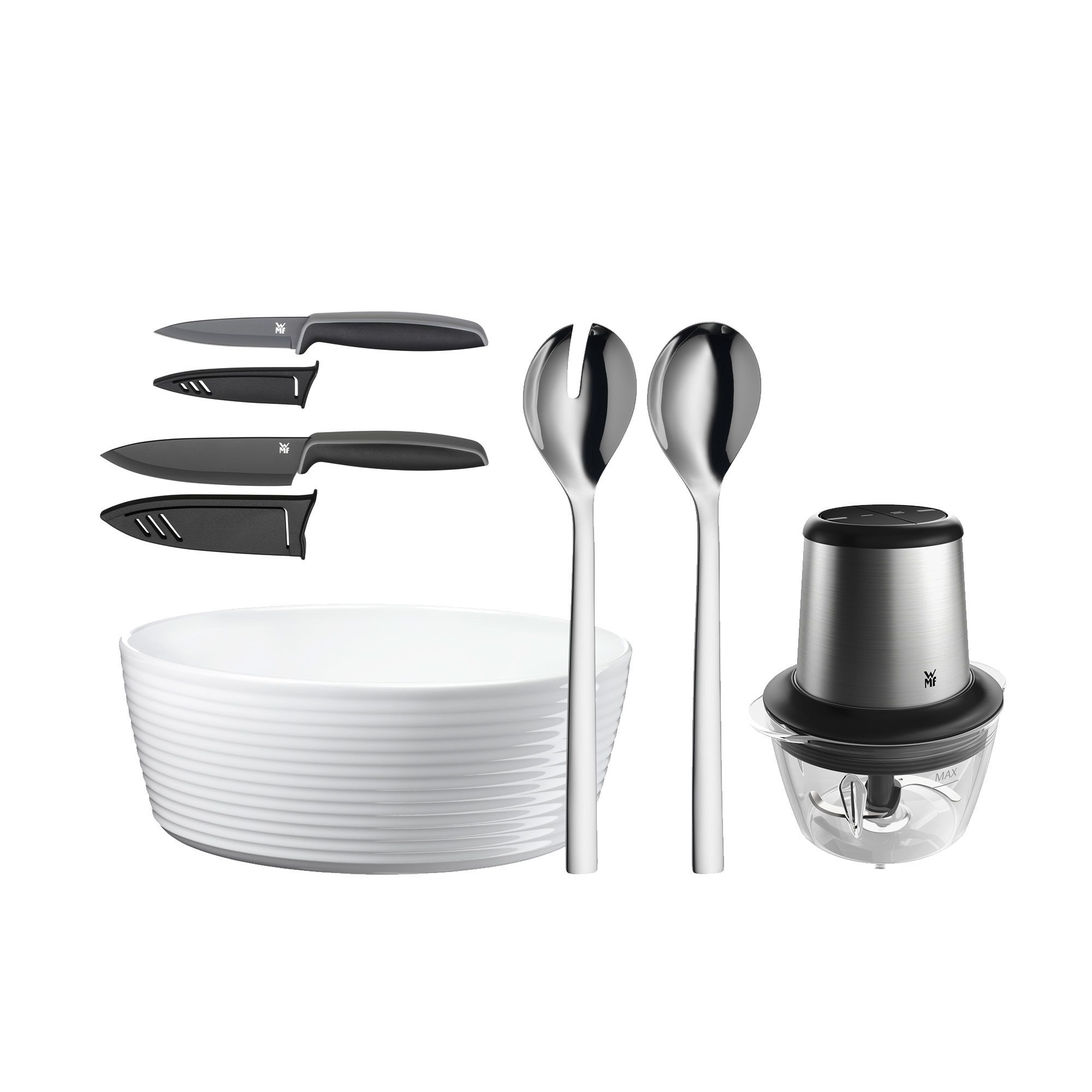 Für mehr Farbe in der Küche: Die Küchenmesser dieses 2-teiligen Touch Messer-Sets von WMF sind ein echter Hinkucker in Form, Farbe und Funktion. Все üblichen Schneidearbeiten sind damit fix erledigt, das Kochmesser übernimmt dabei idealerweise Aufgaben wie das Schneiden und Hacken härterer Zutaten, das Zubereitungsmesser ist für die detaillierten Arbeiten zuständig. Die Messer verfügen über langlebige Schärfe, gehärtete Klingen aus rostfreiem und säurebeständigem, spezialbeschichtetem Klingenstahl sowie rutschfeste ergonomische Griffe, die perfekt in der Hand liegen. Praktische Klingenschutzhüllen ermöglichen die unkomplizierte Aufbewahrung in der Besteckschublade.