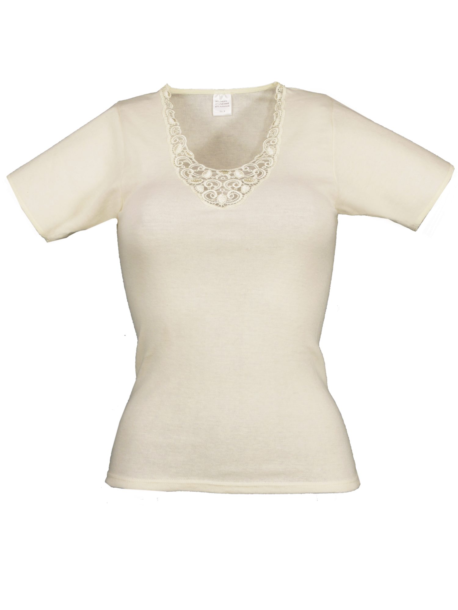 Angenehmes Unterhemd mit Spitzeneinsatz mit 1/2 Arm in der reinen Naturmischung mit 70% Schurwolle und 30% Seide für jeden Tag