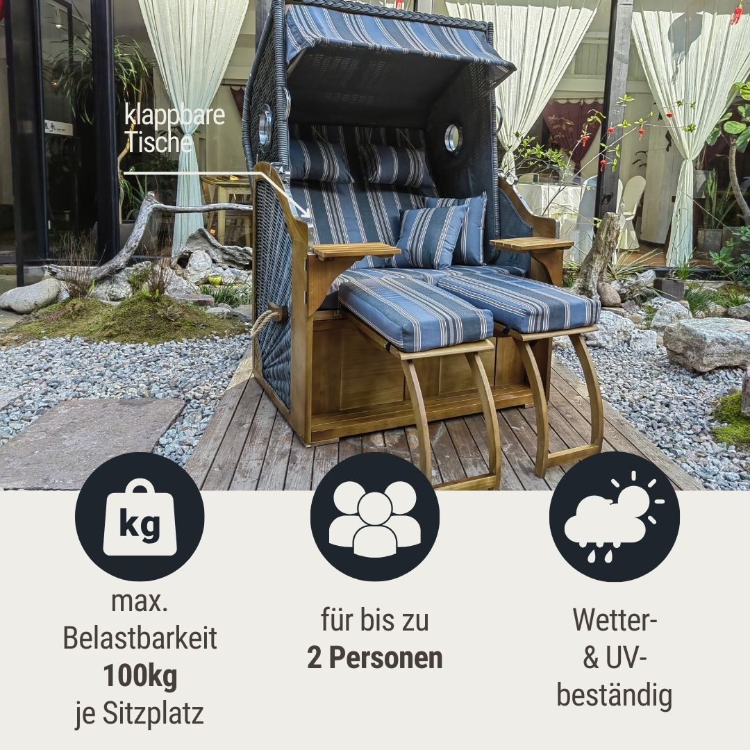 Lieferumfang | 1x Strandkorb, 2x Nackenkissen, 2x Rückenkissen |