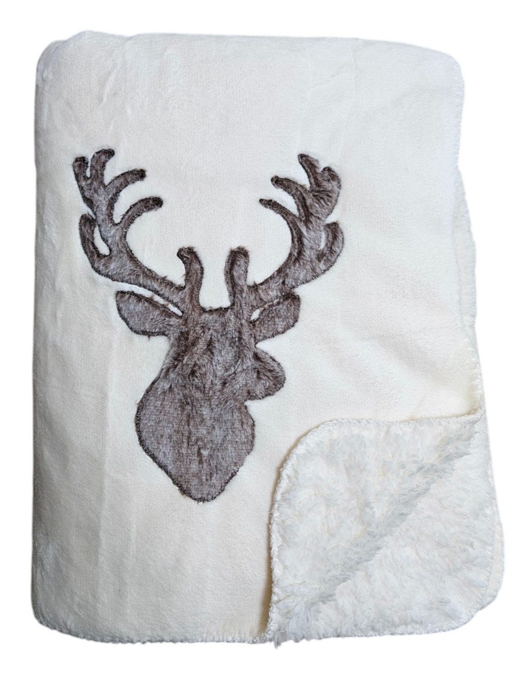 Die Decke ist nicht nur eine praktische Wärmequelle, sondern auch ein dekoratives Highlight: Der moderne Hirschkopf in Felloptik macht aus jedem Wohn- oder Schlafzimmer