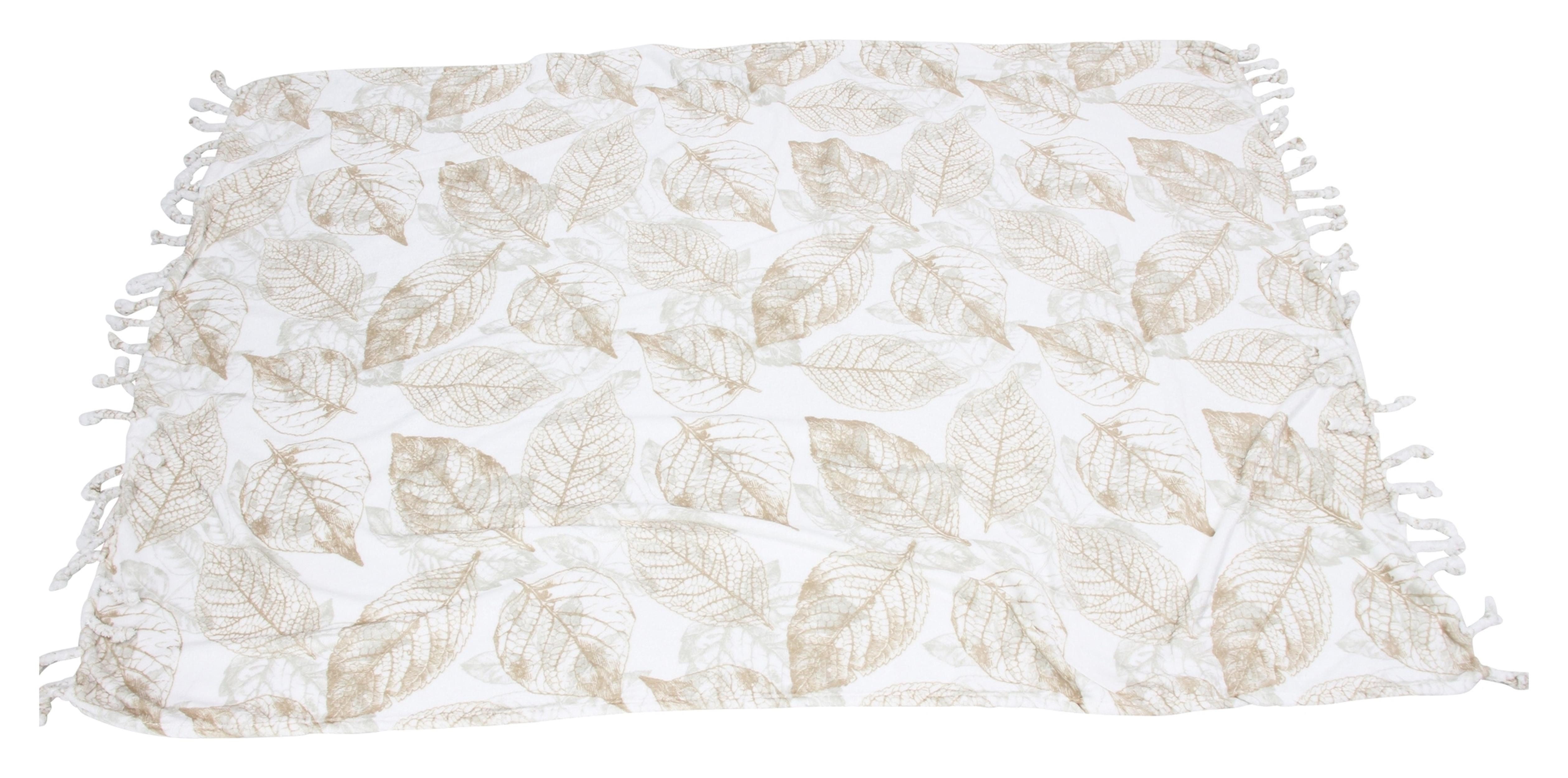 Die Decke zeichnet sich durch einen dezenten Blätter-Print aus, der eine ruhige und entspannende Atmosphäre schafft. Die natürlichen Motive sind geschmackvoll auf dem weißen Hintergrund arrangiert, was die Sofadecke zu einem eleganten Accessoire für jedes Wohnzimmer oder Schlafzimmer macht.