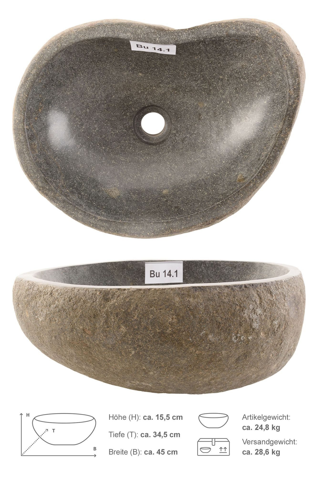 Ein Steinwaschbecken aus indonesischem Flussstein ist eine einzigartige und handgefertigte Waschschale, die aus natürlichen Materialien hergestellt wird. Das Becken hat eine Длина von 40 cm, eine Höhe von 15 cm und wiegt ca 25 kg. Es ist in der Regel in einem ansprechenden Grauton gehalten. Da es sich um Einzelstücke handelt, können die Farbtöne allerdings auch variieren und daher zum Teil auch grünlich oder sogar bräunlich erscheinen. Jedes dieser Waschbecken ist ein Unikat, da es von indonesischen Handwerksbetrieben in aufwendiger Handarbeit gefertigt wird. Wir fotografieren jedes einzelne Unikat. Sie können sich also ihr ganz persönlichen Handwaschbecken aussuchen.