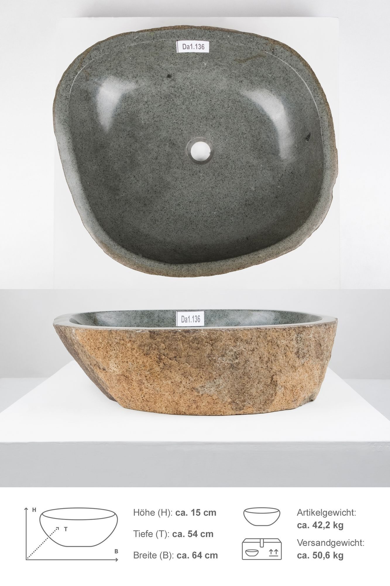 Mit einer großzügigen Höhe von 15 cm und einem Gewicht zwischen ca. 35 und 45 kg ist dieses Waschbecken nicht nur ein ästhetisches Highlight, sondern auch äußerst robust und langlebig. Seine unverwechselbaren, natürlichen Formen erzählen die Geschichte von Jahrtausenden, die der Stein dem Flussbett entrissen wurde.