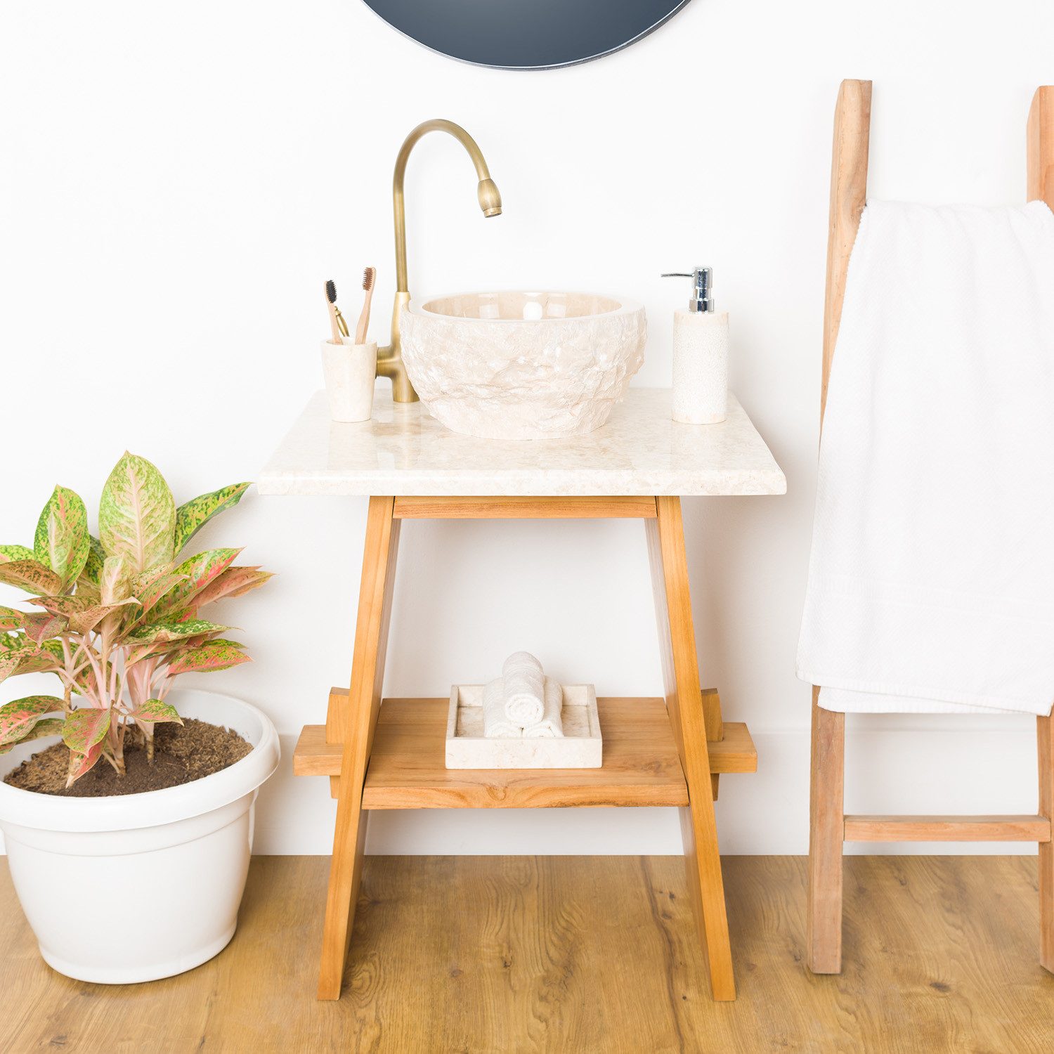 Dieser Waschtisch besticht nicht nur durch die schlichte Eleganz, sondern auch durch seine „inneren“ Werte. Das Untergestell ist aus recyceltem Teakholz, welches beim Rückbau von bis zu 100 Jahre alten Javanesischen Häusern in den Tropen gewonnen wurde. Die Waschtischplatte ist aus indonesischem Marmor und wurde aus einem Marmorblock gefräst, von Hand geschlagen und mit der Flex-Maschine nachbearbeitet und poliert. Unterschiede in Marmorierung, Schattierung und Struktur sind das Zeichen für die Individualität eines jeden Steines. Der Waschtisch bietet ein Fach, welches mit einem Korb ausgestattet werden kann. Somit ist es möglich Bad Utensilien bestmöglich zu verstauen.