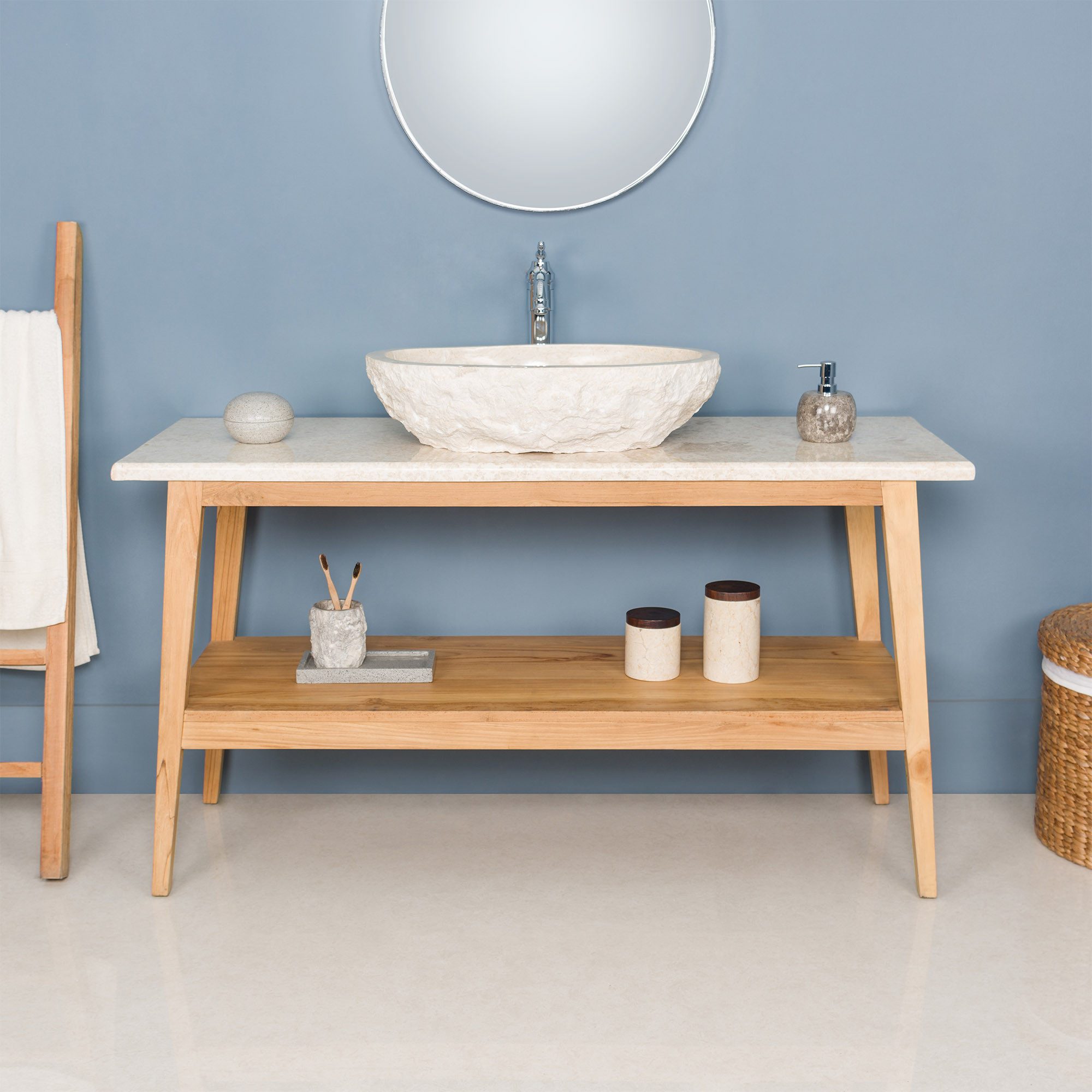 Offener Waschtisch aus Teakholz mit Marmor Platte creme 140 cm breit