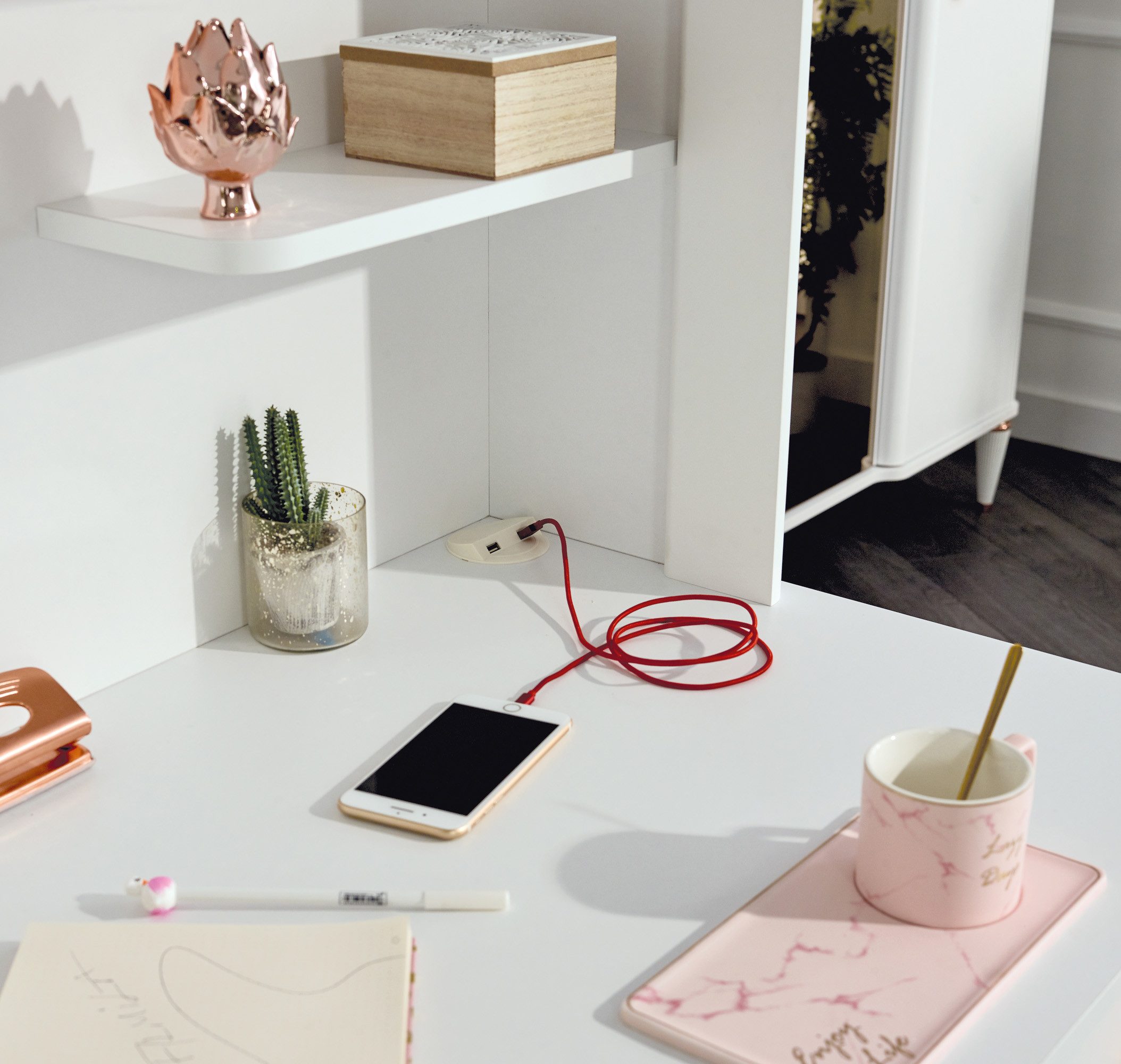Das Schreibtisch-Set "BELLA" ist die ideale Lösung für ein aufgeräumtes und stilvolles Kinder- oder Jugendzimmer. Bestehend aus einem Schreibtisch mit Schublade und Tür sowie einem passenden Schreibtischaufsatz mit 4 Ablagefächern, bietet es viel Stauraum für Schulmaterial, Bücher und kreative Ideen. Der Schreibtisch "BELLA" besticht durch sein modernes Design in Weiß mit goldenen Akzenten und fügt sich harmonisch in jedes Kinderzimmer ein. Die 1 Schublade und 1 Tür bieten praktischen Platz für Hefte, Stifte und Zubehör. Besonders clever: 2 integrierte USB-Stromanschlüsse, mit denen Tablet oder Lampe ganz einfach geladen werden können. Der dazugehörige Schreibtischaufsatz sorgt mit 4 offenen Fächern und 1 Tür mit rundem Griff für noch mehr Ordnung – ideal für Bücher, Spielzeug oder Deko. Maße: Schreibtisch: B 120 x T 65 x H 77 cm Schreibtischaufsatz: B 120 x T 31 x H 93 cm