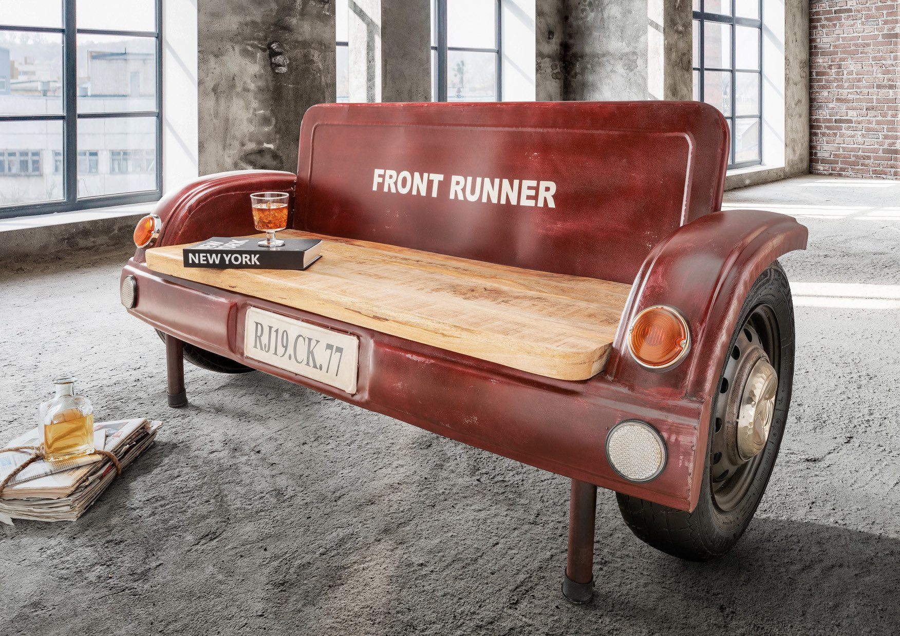 Die Autobank „Frisco“ ist ein echtes Designstatement und ein Highlight für alle, die das Besondere lieben. Gefertigt aus echtem Metall im Vintage-Rot und kombiniert mit Sitzflächen aus massivem Mangoholz, erinnert dieses außergewöhnliche Möbelstück an die charmante Front eines alten US-Oldtimers. Scheinwerfer, Kühlergrill und Kotflügel sind detailgetreu nachgebildet und verleihen der Bank ihren unverwechselbaren Charakter. Die stabile Sitzfläche aus Holz sorgt für rustikalen Kontrast und macht „Frisco“ zum idealen Möbel für Eingangsbereiche, Cafés, Showrooms oder Wohnzimmer mit Stil. Jedes Stück wird in Handarbeit gefertigt, sodass kleine Unterschiede in Lackierung und Verarbeitung gewollt sind und die Bank zu einem einzigartigen Unikat machen.