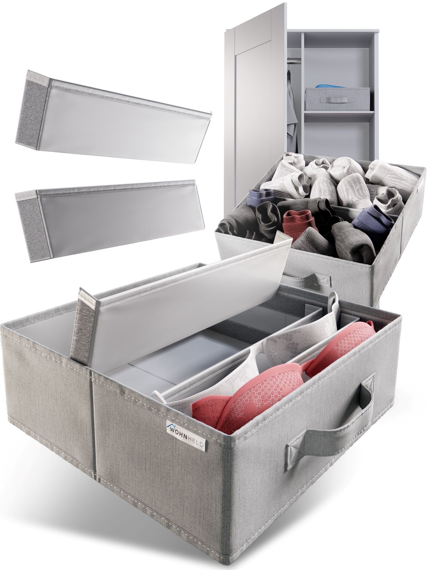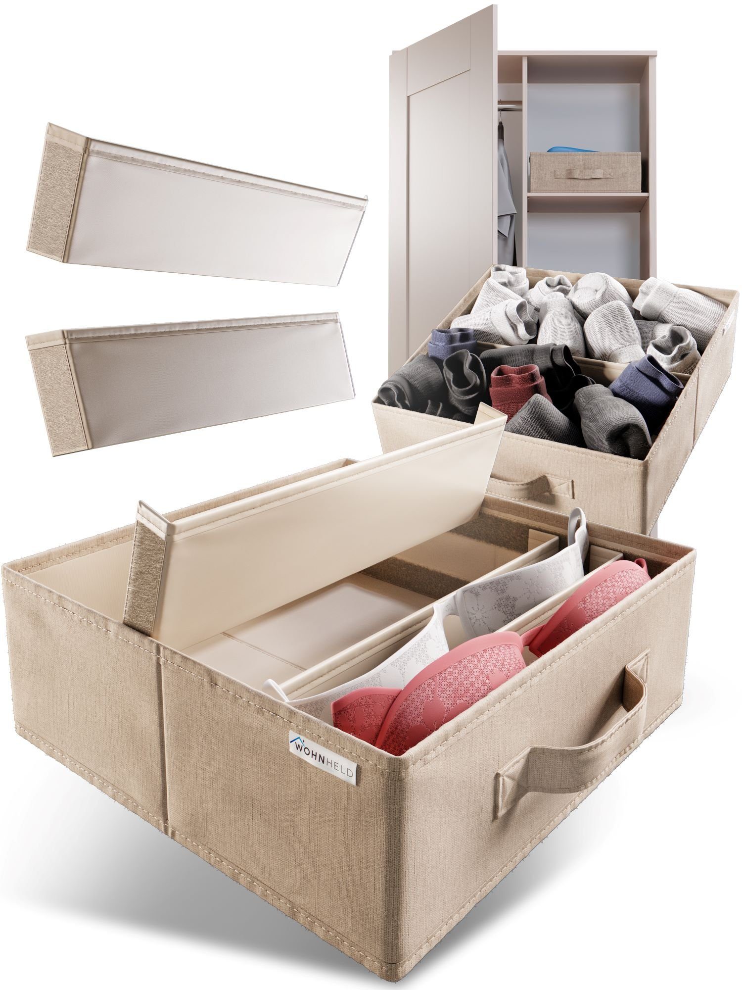 hochwertiger Stoffbezug, stabil, sieht toll aus, superpraktisch mit den variabel einsetzbaren Trennwänden und dem Griff zum herausziehen
