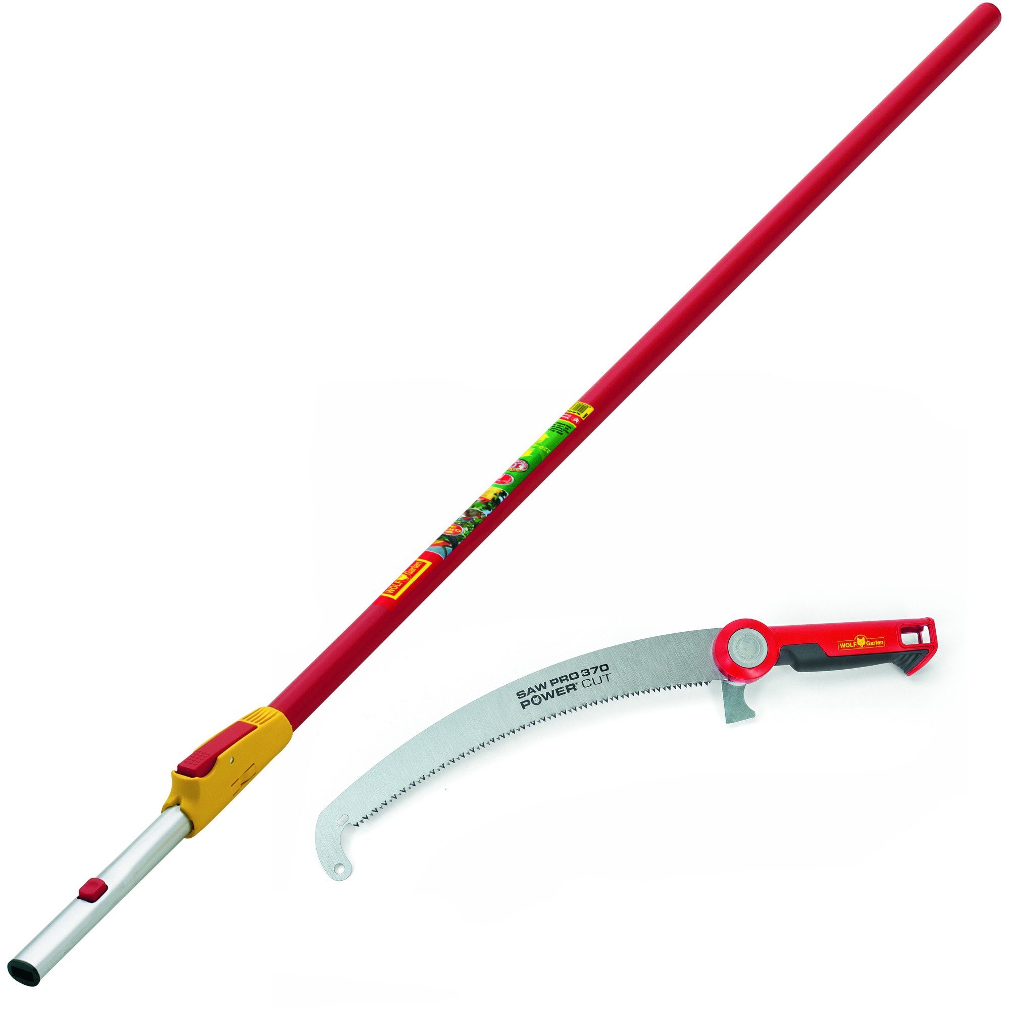 PCSPRO 370/ZM-V4 Die Astsäge Power Cut Saw Pro 370 von WOLF-Garten mit dem innovativen MaxControl-Griff ermöglicht jederzeit maximalen Halt. Mit dem integrierten multi-star Adapter kann man für höher liegende Äste einfach und schnell einen Vario-Stiel anbringen. Dank der speziellen Druck- und Ziehzahnung und dem gebogenen Sägeblatt mit integriertem Asthaken und Rindenanritzer sägt man immer mühelos und kraftvoll, mit klarer Schnittoberfläche. Die integrierte Schutzhülle verhindert dabei ein versehentliches Öffnen der Verbindung beim Arbeiten in den Bäumen. Äste per Hand abzusägen, war noch nie so einfach. Das Set enthält den Vario-Stiel ZM-V 4, welcher sich beliebig auf die Wunschlänge ausziehen lässt.