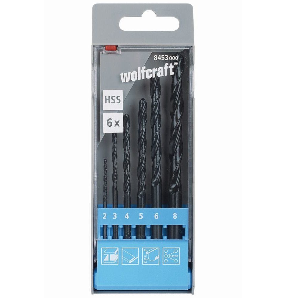 In diesem Set befinden sich je 1 Bohrer von ø 2/ 3/4/ 5/ 6 und 8 mm. Dieser rollgewalzte HSS-Spiralbohrer (=HSS-R) ermöglicht schnelles Bohren in Metall. Dieser Bohrer ist zum Bohren von Durchgangs- und Zentrierlöcher in legierten und unlegierten Stahl, in Nichteisenmetalle, Gussstahl, Gusseisen und Kunststoff geeignet. Der Schaft ist zylindrisch und entspricht dem Bohrerdurchmesser. Er ist für Standbohrmaschinen und Bohrschrauber vorgesehen. Es besteht ein niedriges Bruchrisiko da er einen elastischen Körper hat. Die mit Schwarzoxid beschichtete Nut ermöglicht eine schnelle Entfernung der Späne. Der HSS-Spiralbohrer wird nach DIN 338 hergestellt und ist ein Bohrer Typ N (kleiner Seitenspanwinkel) mit einem Spitzenwinkel von 118°.