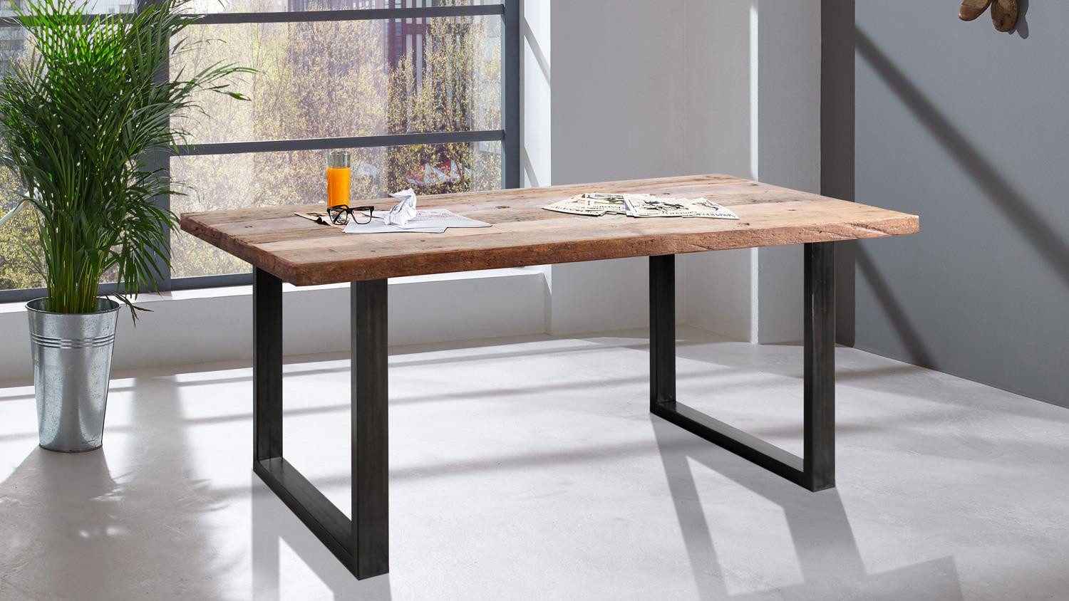 Dieser charmante Esszimmertisch bringt seinen ganz eigenen Charme mit sich. Gefertigt aus recyceltem Altholz, versprüht der Esstisch einen einzigartigen Flair, welcher nicht zuletzt durch die bewusst belassenen Risse und Einkerbungen deutlich wird. So erhalten Sie garantiert ein unverwechselbares Einzelstück.
