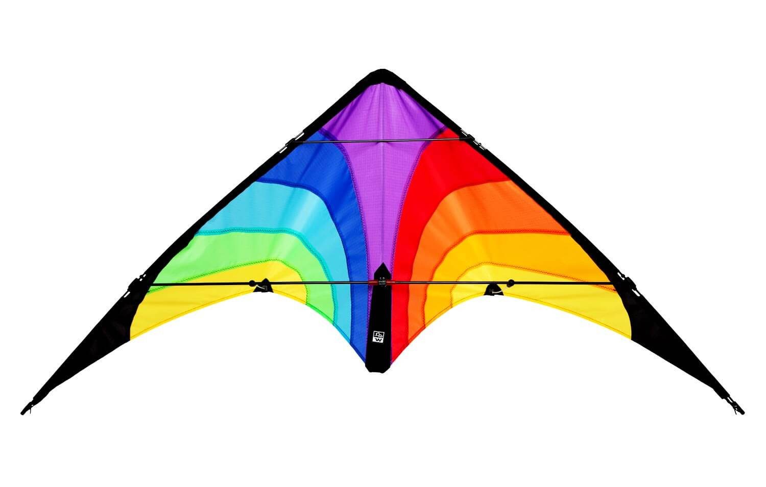 Der Wolkenstürmer Lenkdrachen Fancy im Regenbogen-Design ist unser kleinster Glasfaser-Drachen. Mit einer Spannweite von 130 cm ist er wenig zugkräftig, aber sehr agil in der Luft. So kannst bereits du nach den ersten Flugversuchen auch schon kleinere Tricks üben. Fancy ist für alle Einsteiger-Piloten ab 6 Jahren geeignet. Das robuste 4 mm Glasfibergestänge und das reißfeste Schikarex Drachentuch machen den kleinen Flitzer zu einem stabilen Drachen. Sollte euch dennoch einmal ein Stab zu Bruch gehen, weil die „Landung“ etwas zu hart war, hat der Hersteller Wolkenstürmer auch Ersatzteile und Ersatzstäbe in seinem Online Shop. Der Fancy lässt sich kinderleicht aufbauen: du steckst die zwei Spreizstäbe in die Seitenverbinder - achte dabei darauf, dass die schwarze Waageleine frei hängt und nicht an die Stäbe stößt. Anschließend wickelst du deine 2x 25 m lange 45 kp starke Polyesterleine von dem schwarzen Wickelbrett, (dem sogenannten Winder) komplett ab und zieht den Drachen an den mitgelieferten Lenkschlaufen in den Wind. Hierfür benötigst du ca. 2-4 Bft. Windstärke. Du kannst dir auch etwas Hilfe beim Starten des Drachens holen, indem eine zweite Person den Drachen beim Starten etwas in die Luft wirft. Du lenkst deinen Fancy als würdest du eine Acht malen, in ständiger Bewegung am Himmel. Nach dem Fliegen wickelst du beide Flugleinen wieder auf den Winder auf. Am besten machst du das auf Kreuz, damit das Material geschont wird und sich die Leinen beim nächsten Starten besser abwickeln lassen. Tipp: Den Fancy gibt es nun auch in einem ganz neuen sportlichen Design, als türkise (teal) Варианты!