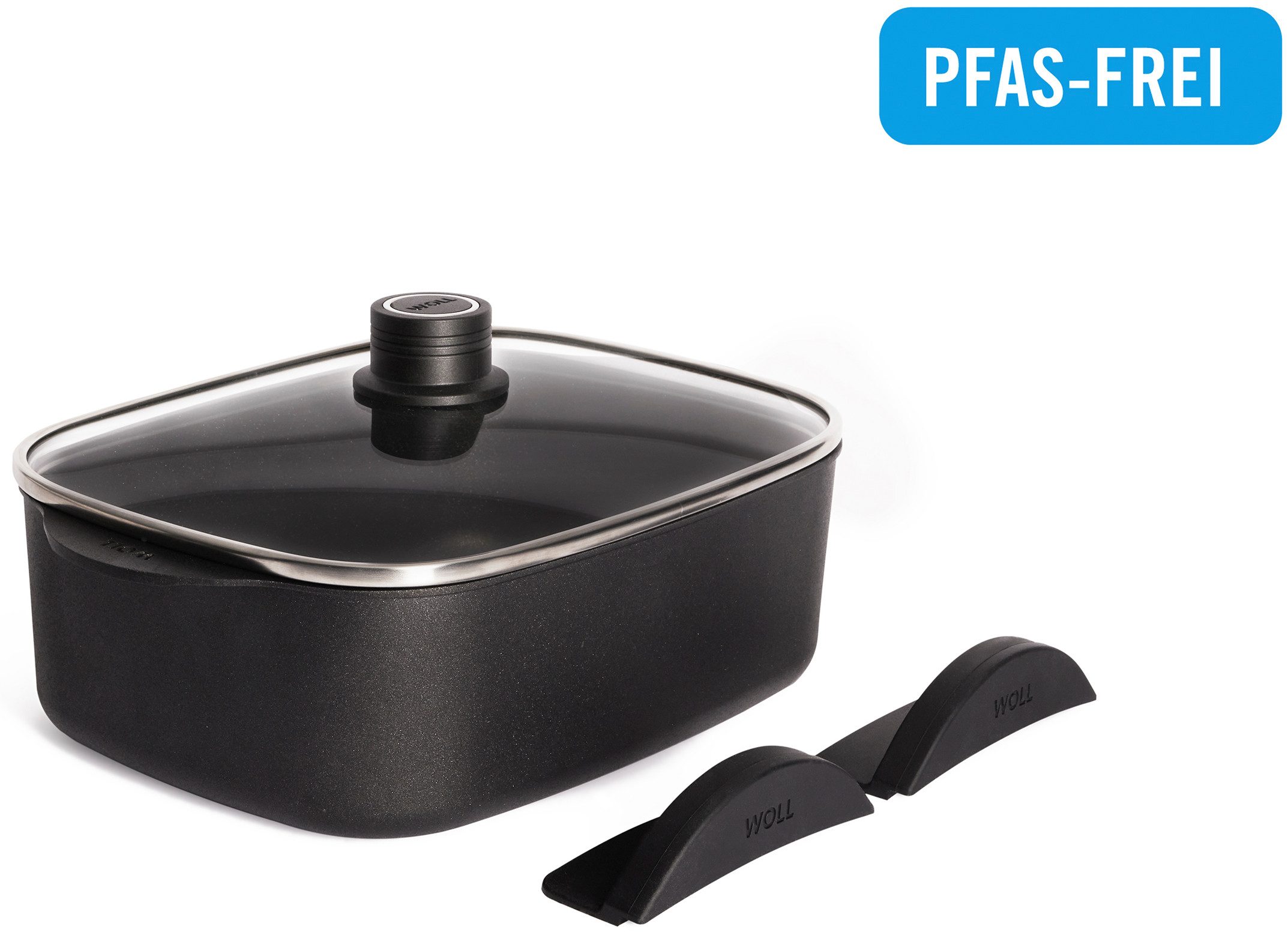 DIE ZUKUNFT DES KOCHGESCHIRRS. Zur Logic Serie, in der unser ganzes Wissen steckt, kommt jetzt die Eco Logic QXR, die Варианты. Bislang bedeutete der Verzicht auf Forever Chemicals auch ein Verzicht auf hervorragende Antihaft-Eigenschaften. Jetzt haben wir bei uns im Saarland eine Versiegelung mit Woll-typischer Performance entwickelt. Unvergleichlich robust garantiert sie leckere Röstaromen. Das Designerstück ist optional mit einem FSC® zertifizierten Holzgriff verfügbar. Und selbstverständlich so durchdacht verpackt wie entwickelt – in einem 100% recycelten Karton, mit Tinte bedruckt.