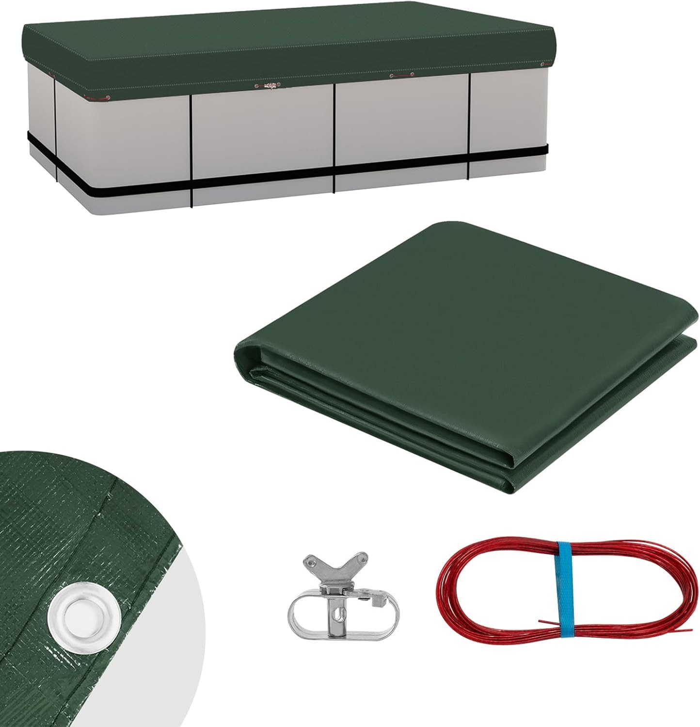 Lieferumfang | 1x Abdeckplane für Pool, 1x Alu-Befestigungselement, 1x Drahtseil |