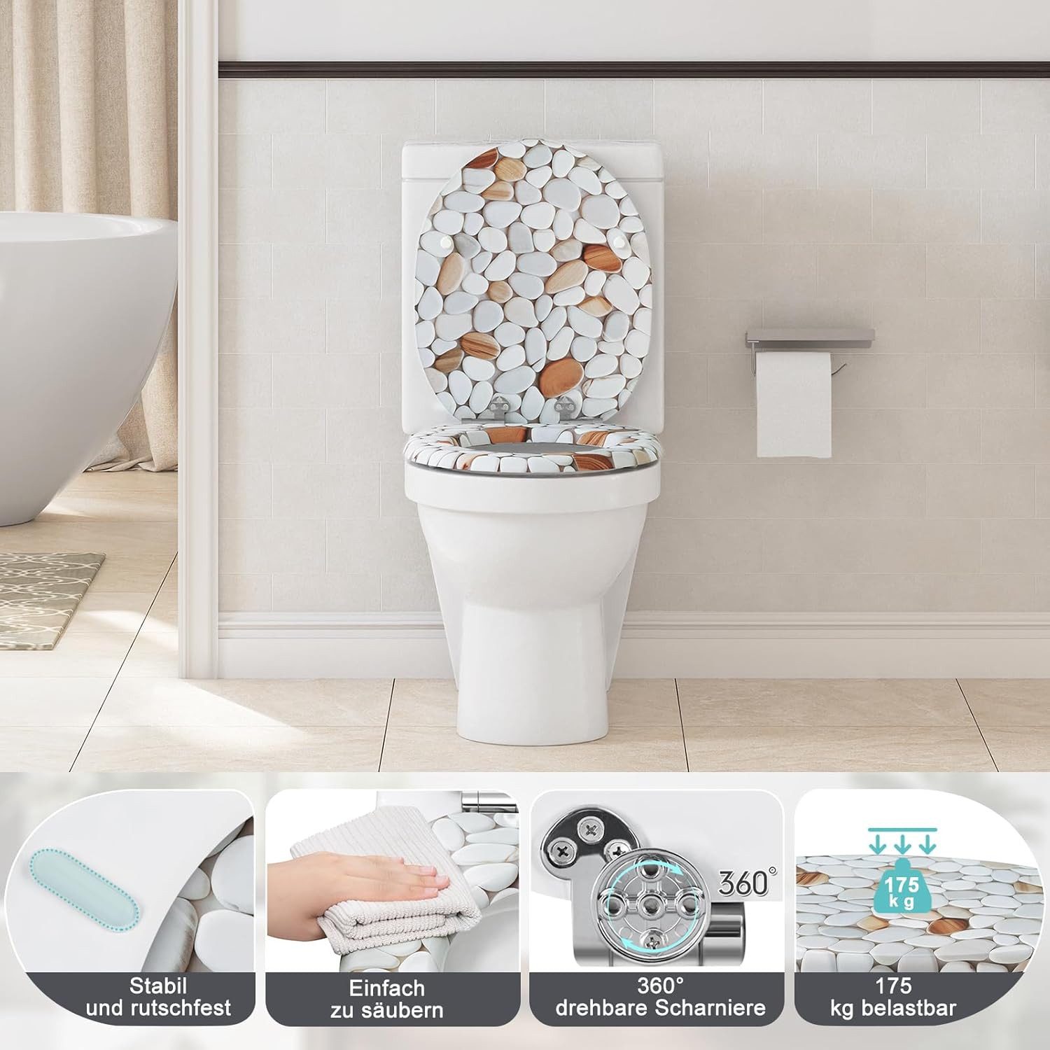 Ausgewähltes Material: Aus hochwertigem MDF mit bedruckter Oberfläche und beschichtet mit PVC-Schutzfolie, ist der Klodeckel robust, langlebig und leicht zu reinigen.
